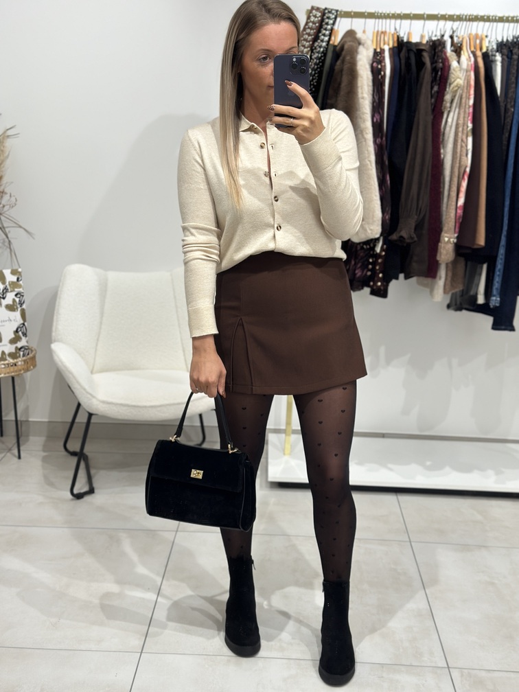 Jupe-short WANDA Jupe-short Couleur : marron Uni Coupe regular (droite) Taille plutôt haute Tailles = S : 36, M : 38, L : 40, Longueur = S: 37 cm, M: 38 cm, L: 39 cm Largeur = S: 35 cm, M: 36 cm, L: 37 cm Composition : 97% polyester, 3% élasthanne Le modèle porte du S et mesure 1m65