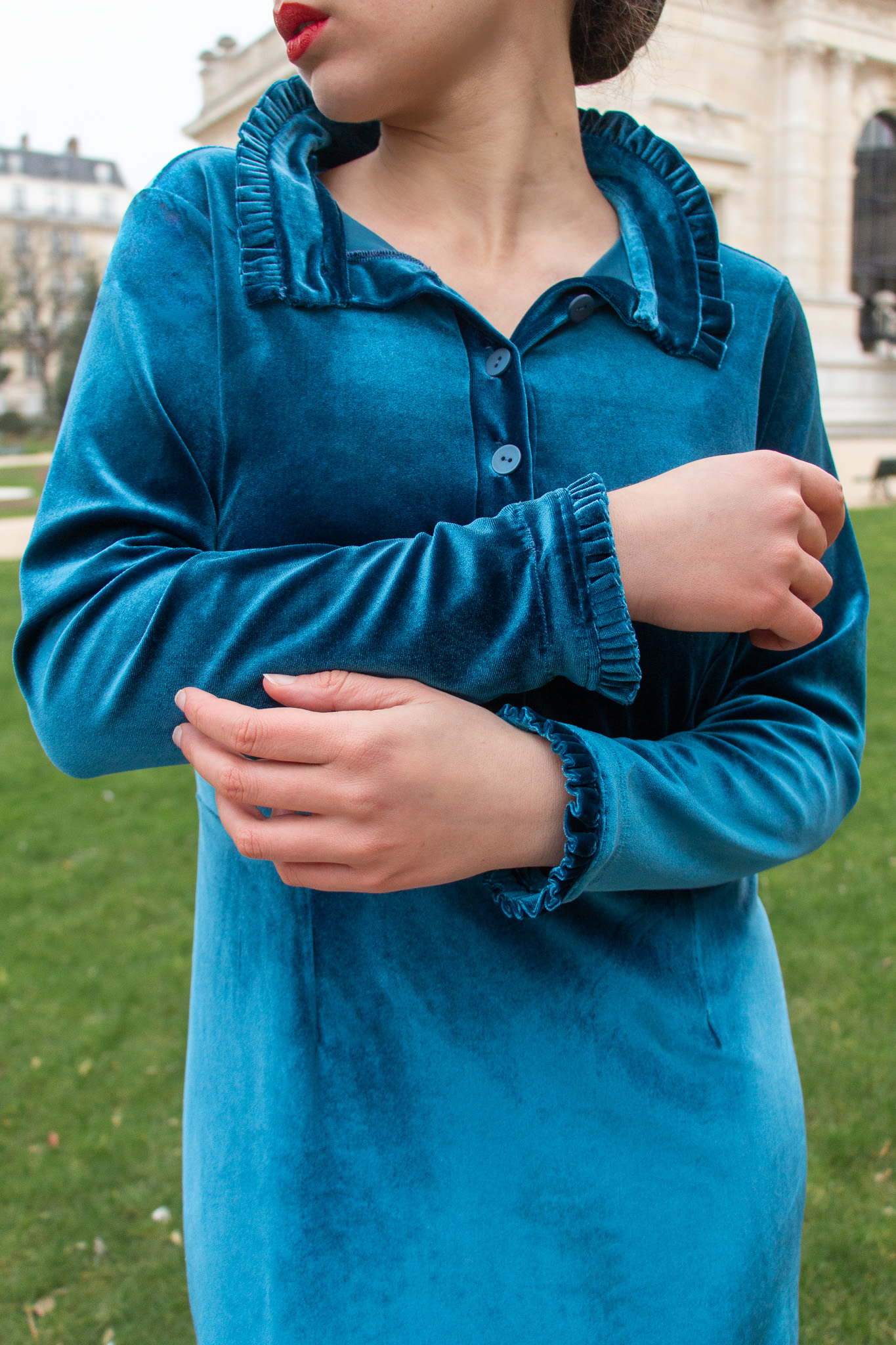 - Des poignets et un col ruchés très travaillés qui en font une robe d’exception