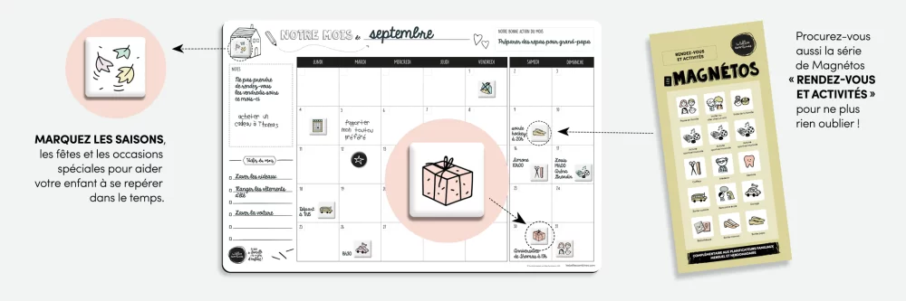 Une gamme complète de pictogrammes magnétiques et ludiques qui développeront l’autonomie des plus petits et le sens de l’organisation des plus grands … même de papa et maman ! Intégrez-les au planificateurs familiaux mensuel et hebdomadaire