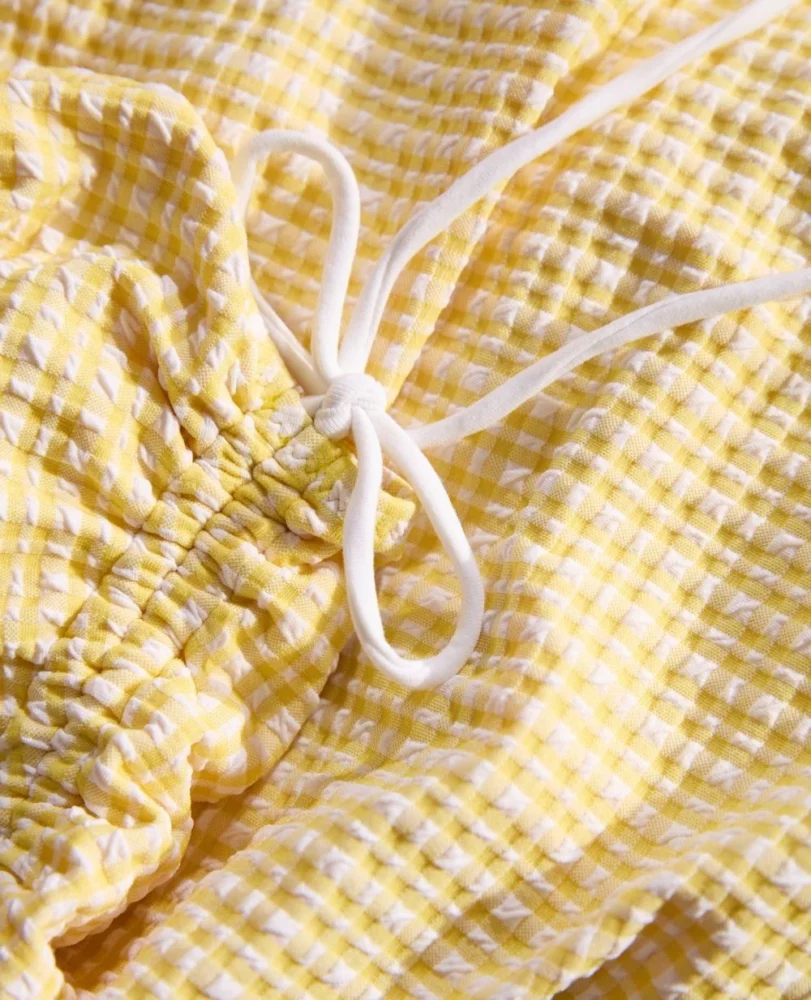 Le motif vichy jaune apporte une touche de fraîcheur et de féminité. Les fronces ajustables sur les côtés permettent d’adapter le maillot à l’évolution de la silhouette, offrant ainsi un confort personnalisé. Les bretelles à nouer offrent un ajustement parfait et peuvent être dénouées pour faciliter l’allaitement.