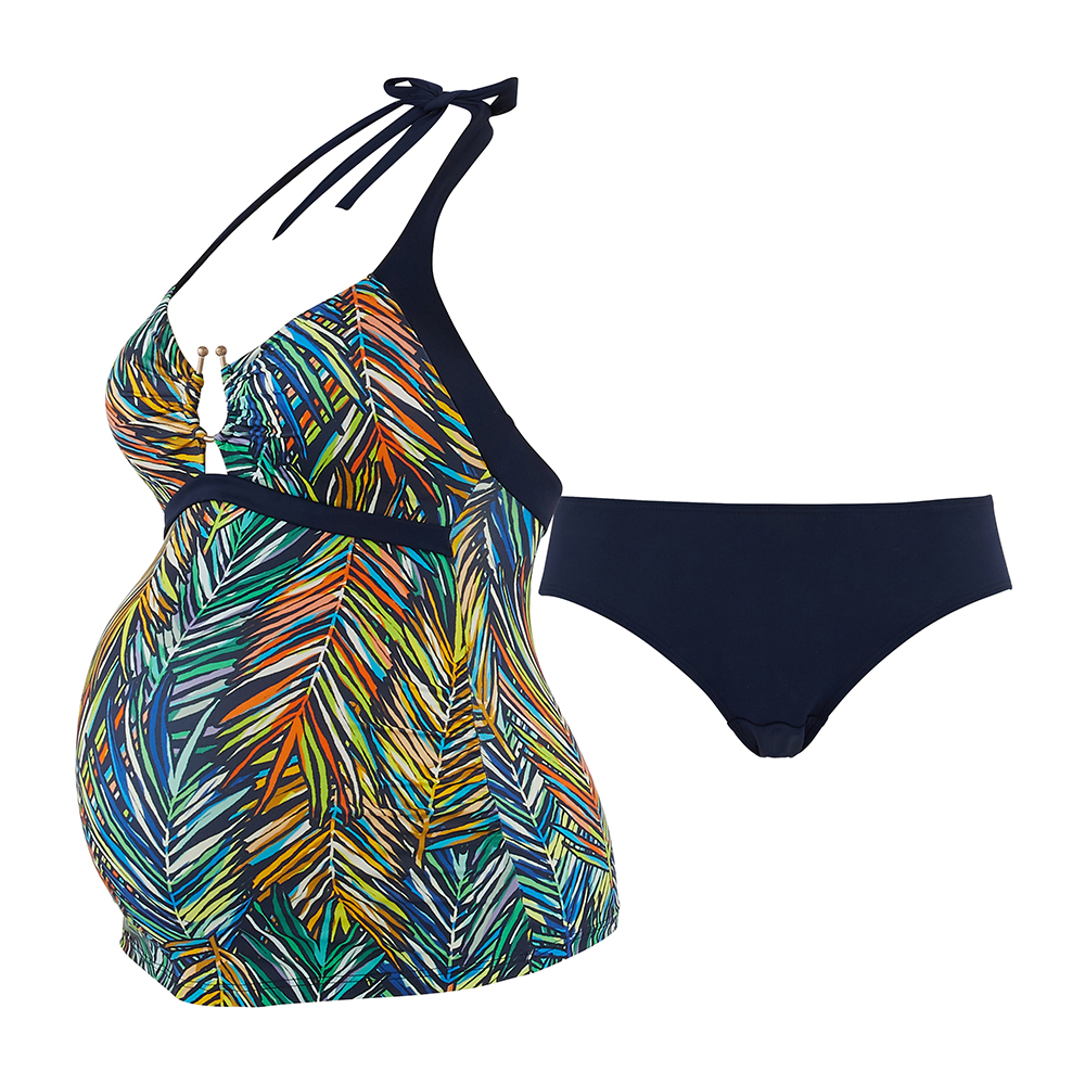 Le haut du tankini Palm Beach arbore une forme effet bandeau ainsi qu’un bijou effet or rose à l’entre bonnet offrant une subtile ouverture du décolleté et donc un côté plus sexy au maillot ! Ce maillot de grossesse apporte à votre poitrine un maintien idéal pendant 9 mois grâce à son élastique sous poitrine et ses coques fixes et même après ! Ses larges bretelles marines se nouent autour du cou pour offrir à la future maman un joli dos nu. La culotte du tankini se positionne sous le ventre pour un maximum de bien-être et de confort. La…