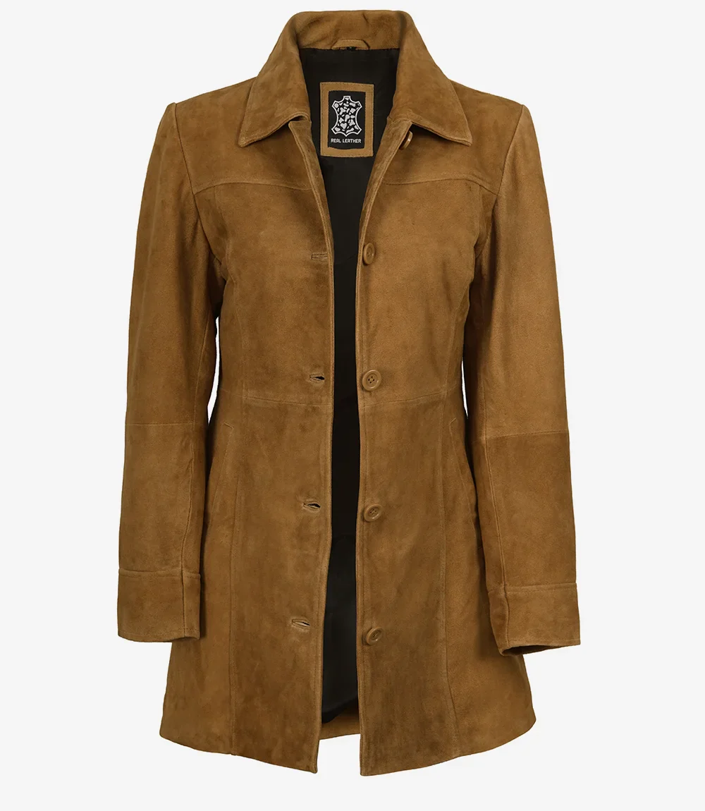 Manteau boutonné en daim marron pour femme, longueur 3/4