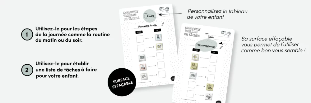 Idéal pour établir la routine du matin, la routine du soir, l’horaire de la journée, les tâches à réaliser et plus encore !