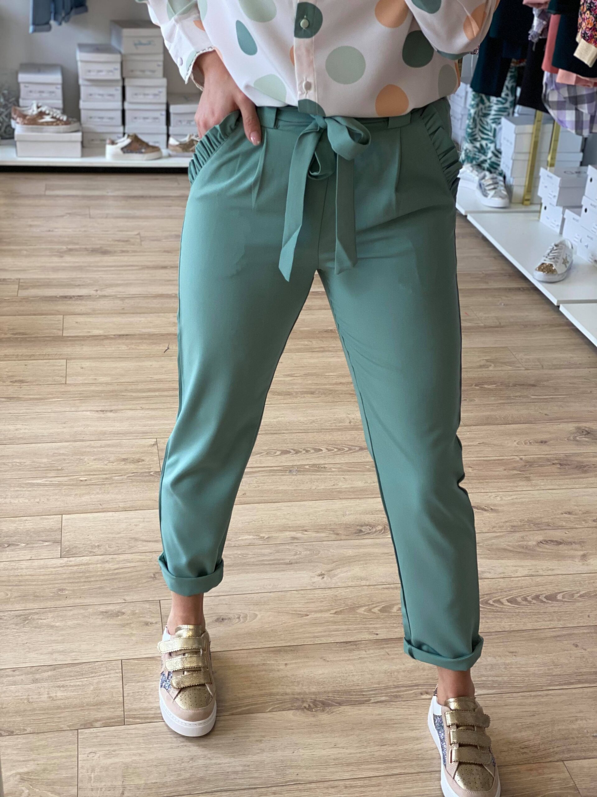 Pantalon ALEX VERT D’EAU Pantalon Coloris : Vert d’eau Coupe droite dans le bas Volant sur les poche Elastique à l’arrière de la taille Prendre sa taille Tailles : S / M / L / XL Composition : 100% polyester Le modèle porte mesure 1m65 et porte du S