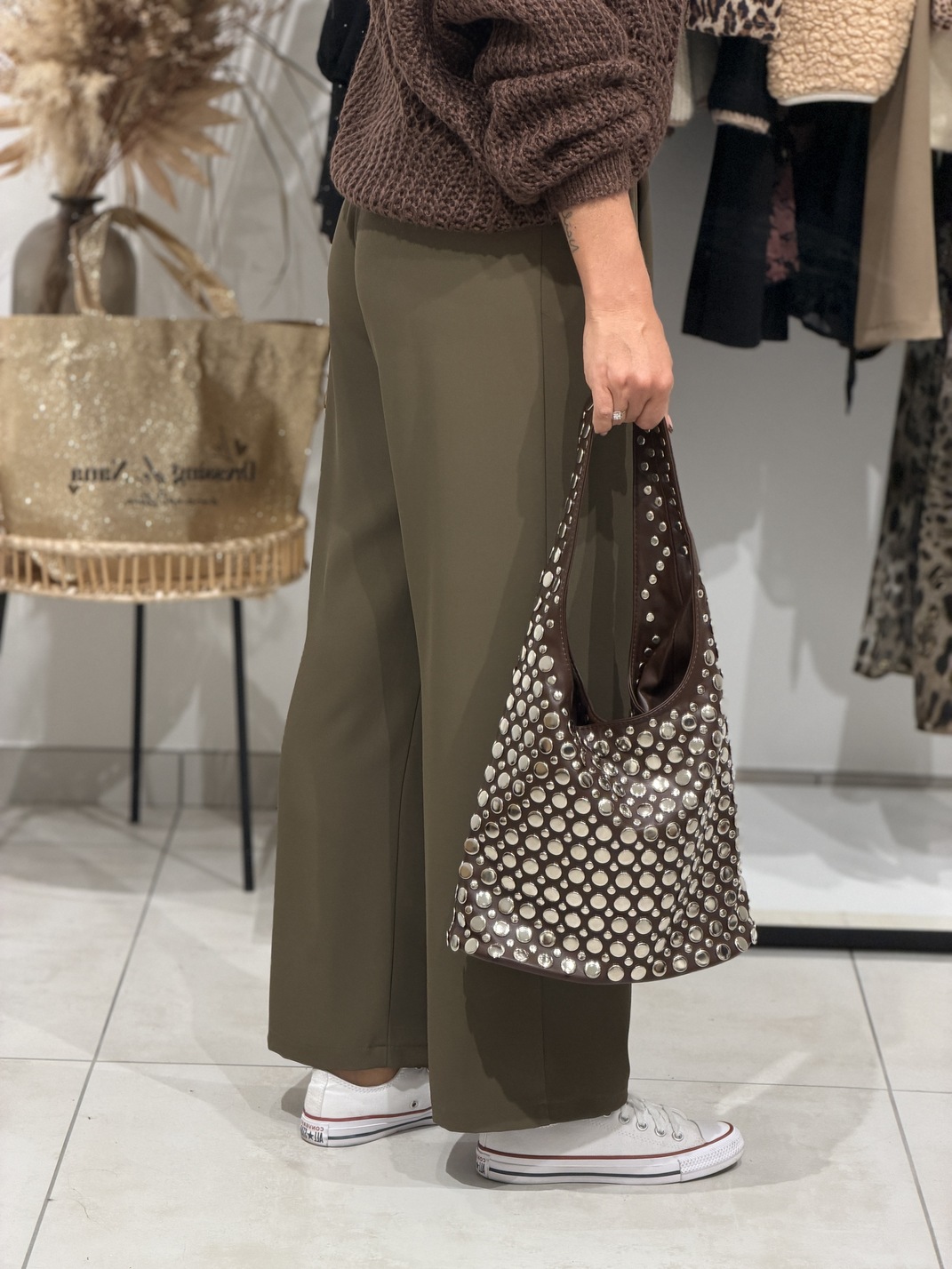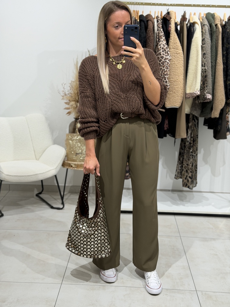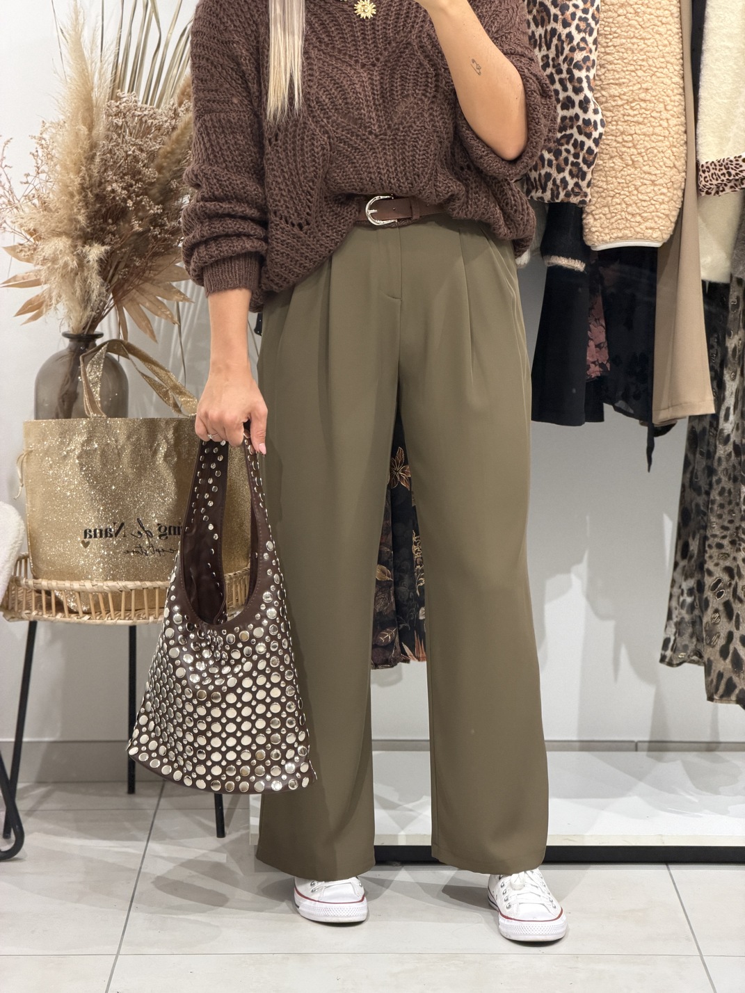 Pantalon SOLAL Kaki Pantalon à pinces Couleur : kaki Ceinture Hyper confortable Bas évasé Fluide Tailles = S : 36, M : 38, L : 40 Longueurs = S : 106 cm, M : 107 cm, L : 111 cm Largeurs = S : 33 cm, M : 34 cm, L : 36 cm Composition : 95% polyester, 5% élasthanne Le modèle porte du S et mesure 1m65 Accessoires portés par le mannequin : Pull IMA Chocolat, Sac AMAZING