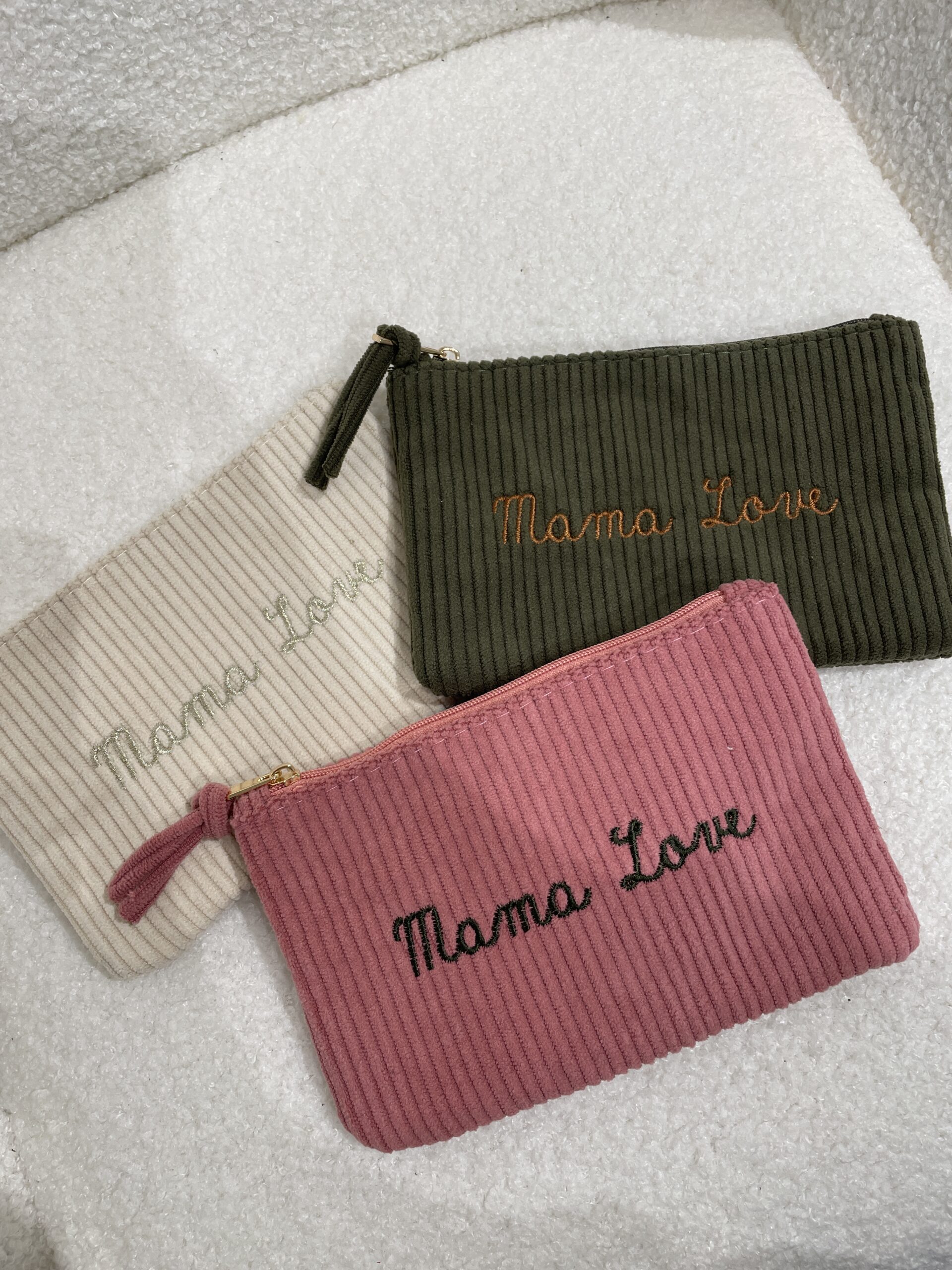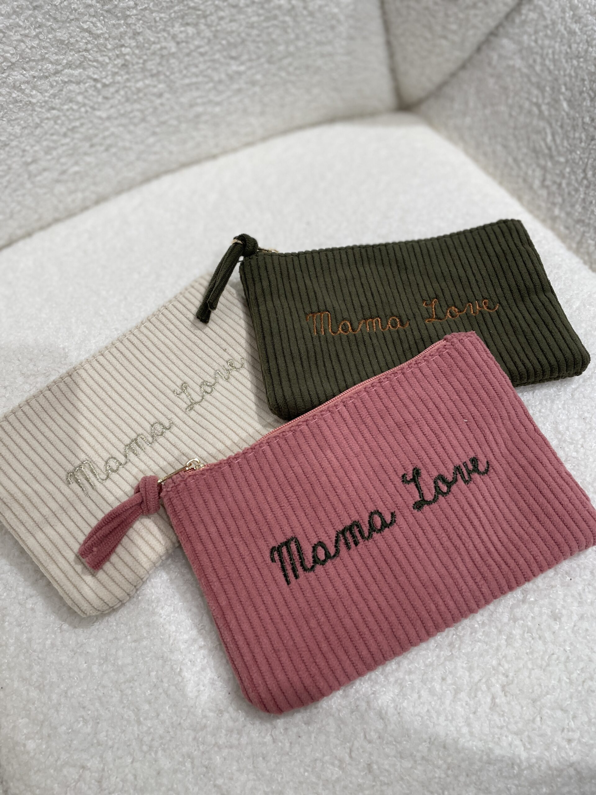 Pochette velours côtelé » MAMA LOVE » Pochette velours côtelé Coloris : rose, kaki & beige Noeud sur la fermeture Se ferme à l’aide d’une fermeture éclaire Mesure 17cm*10cm