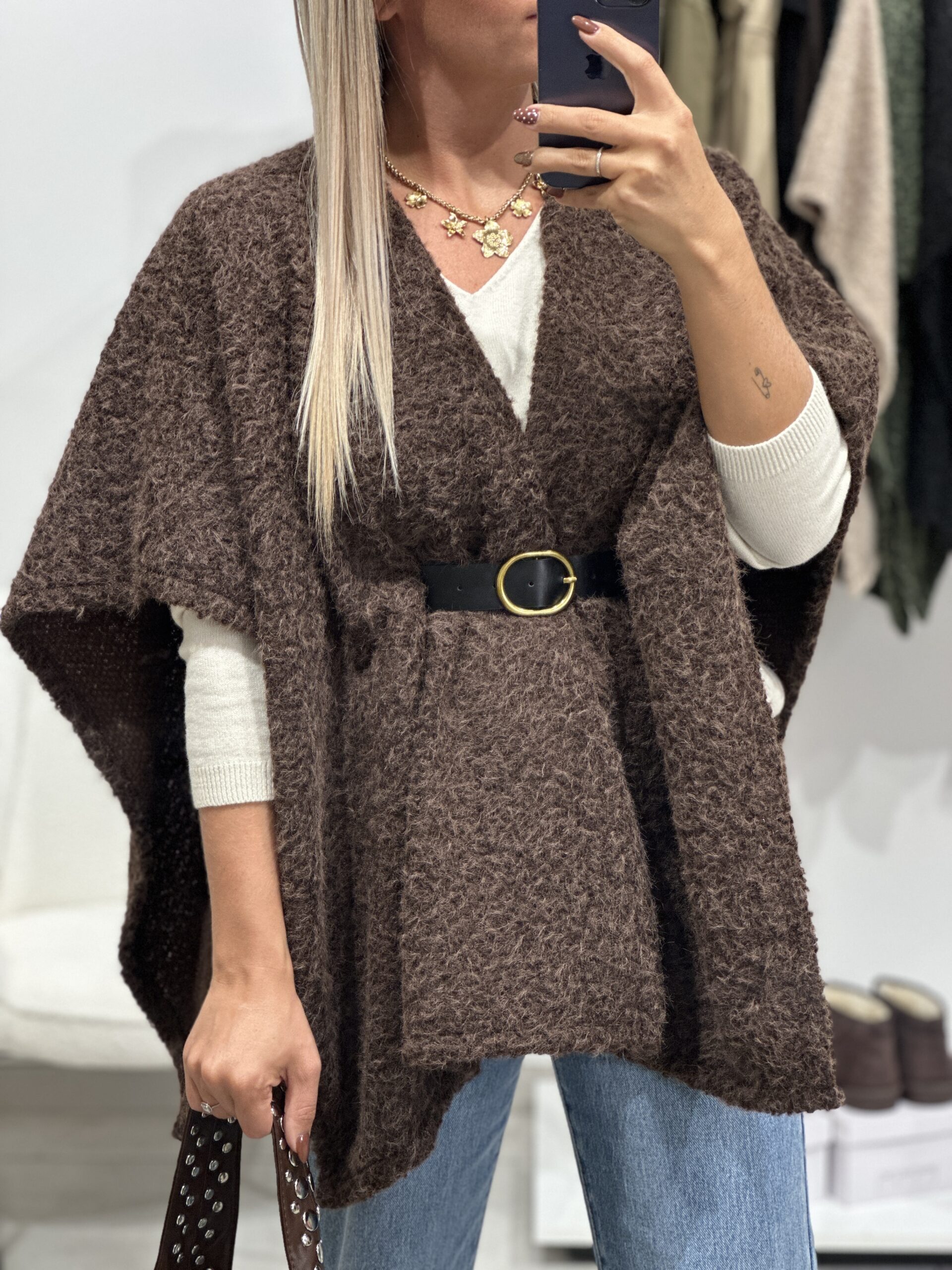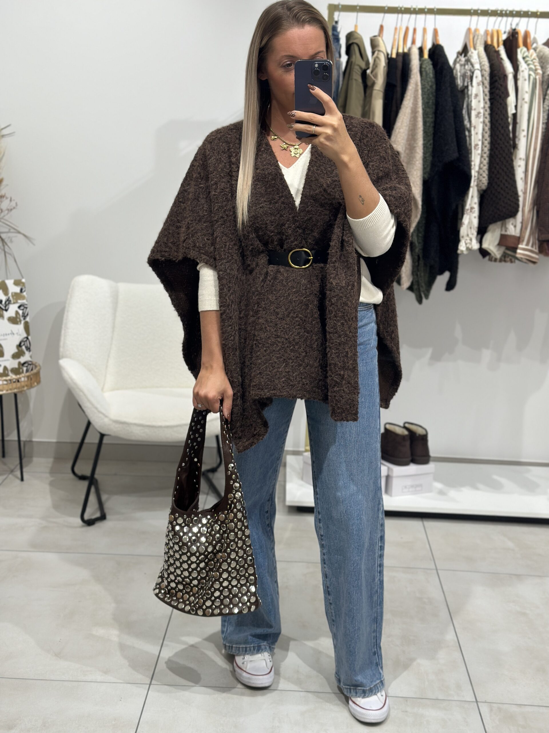 Poncho MAZU – Chocolat Poncho/veste sans manches Couleur : chocolat Uni chiné Coupe oversise Très agréable à porter Taille unique peut convenir du 36 au 42 Longueur : 75 cm Composition : 45% viscose, 30% polyester, 25% laine Le modèle porte du S/36 habituellement et mesure 1m65