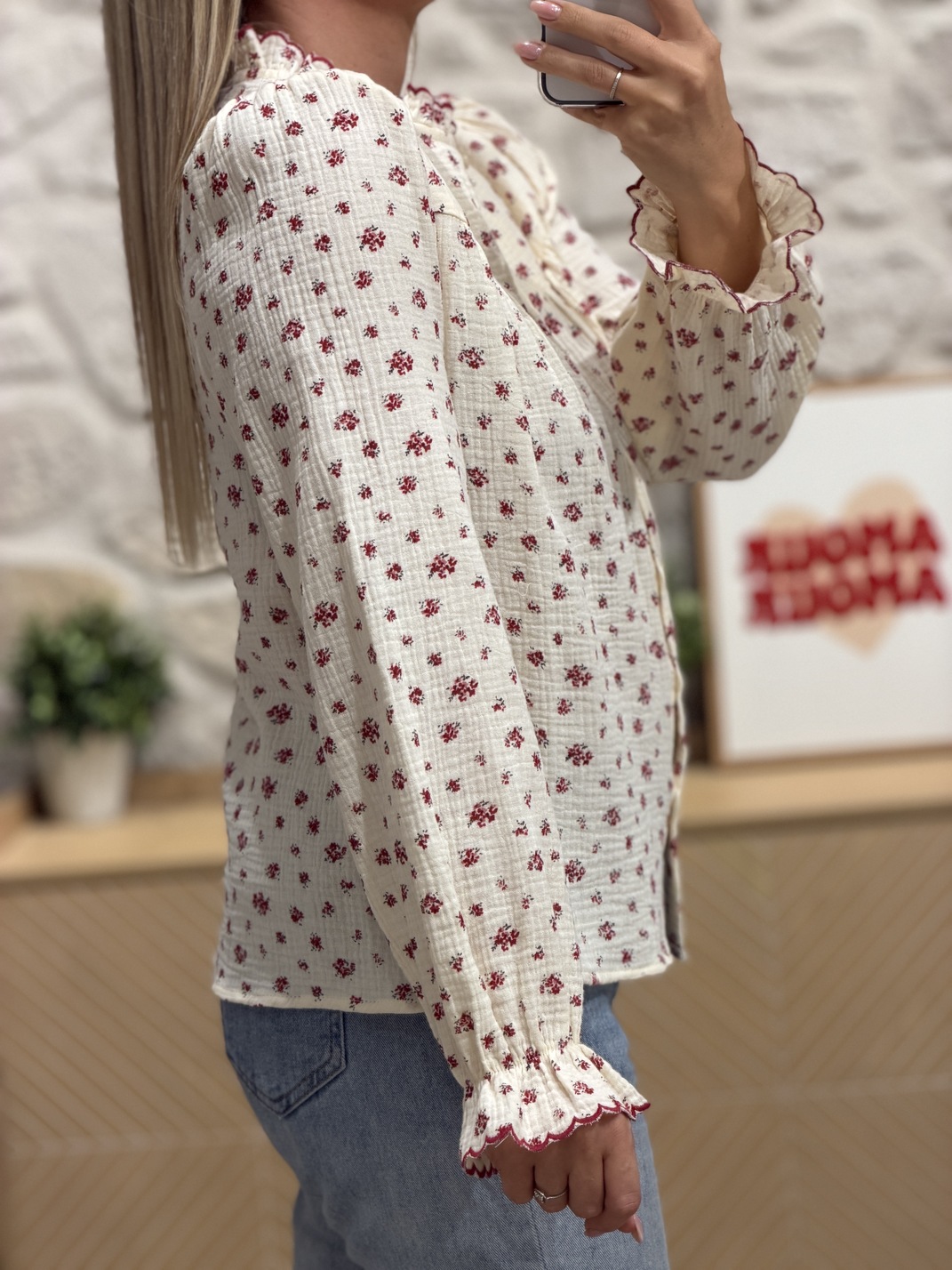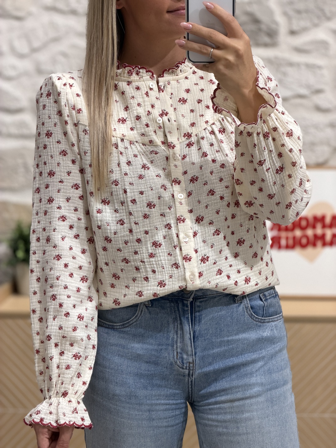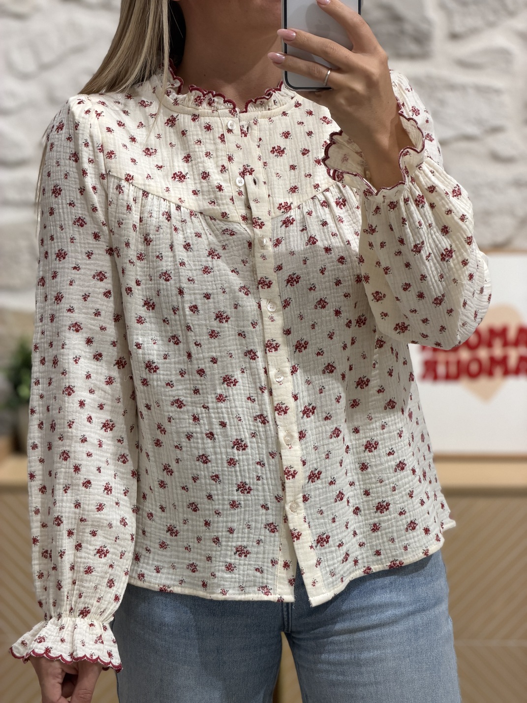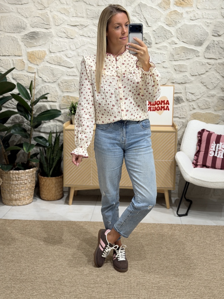 Blouse JASUNA – ROUGE Blouse Coloris : beige & rouge Manches longues Col montant festonné Motif fleuri Boutons Gaze de coton Tailles = S : 36, M : 38, L : 40, XL : 42 Longueurs = S : 59 cm, M : 60 cm, L : 61 cm, XL : 62 cm Largeurs sous aisselles = S : 45 cm, M : 47 cm, L : 49 cm, XL : 51 cm Composition : 100% coton Le modèle porte du S et mesure 1m65 Accessoires portés par le mannequin : Gilet sans manches ÉLIE Crème, Basket RISOTTO