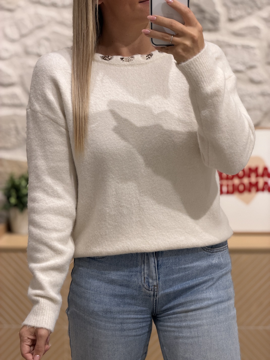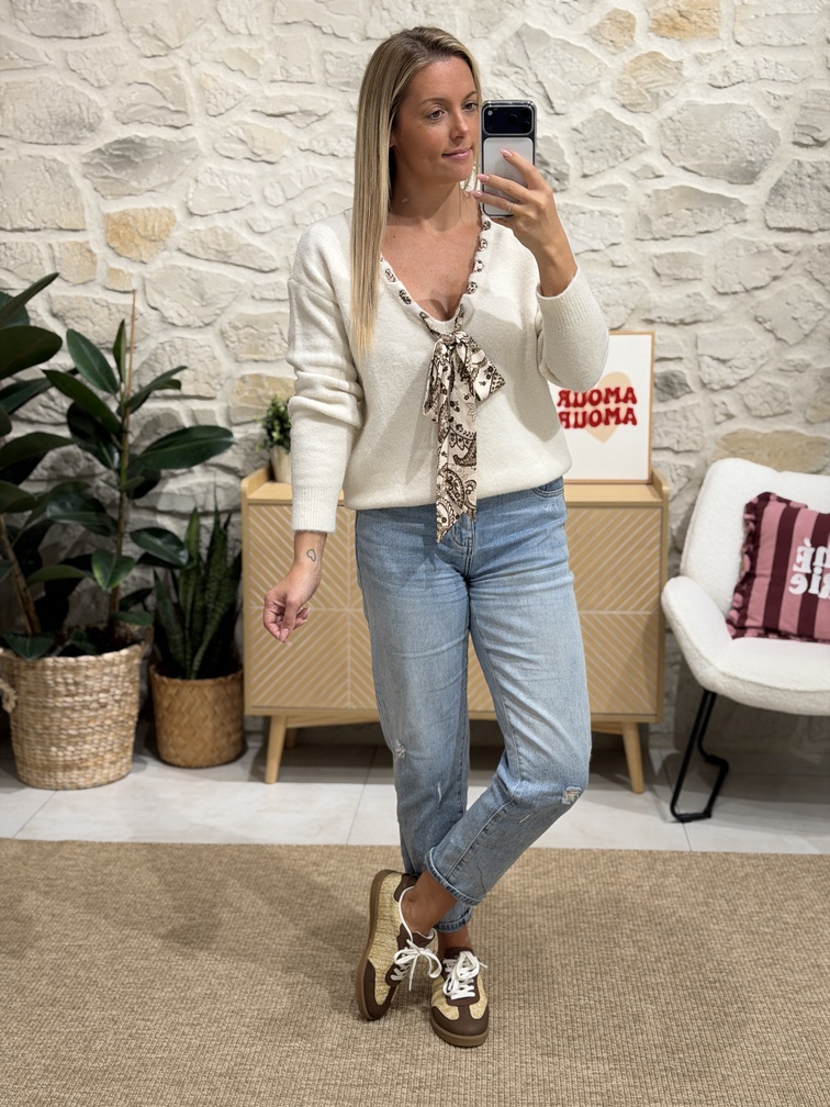 Pull ELEVEN Pull Coloris : beige & marron Réversible Col rond Col V avec lacet à motif dans le dos Motif cachemire sur le lacet Très agréable Manches longues Coupe droite Taille unique peut convenir du 36 au 42 Longueur : 64 cm Largeur sous aisselle : 47 cm Composition : 50% polyamide, 35% viscose, 10% laine, 5% élasthanne Le modèle porte du S habituellement et mesure 1m65 Accessoires portés par le mannequin : Basket GASY