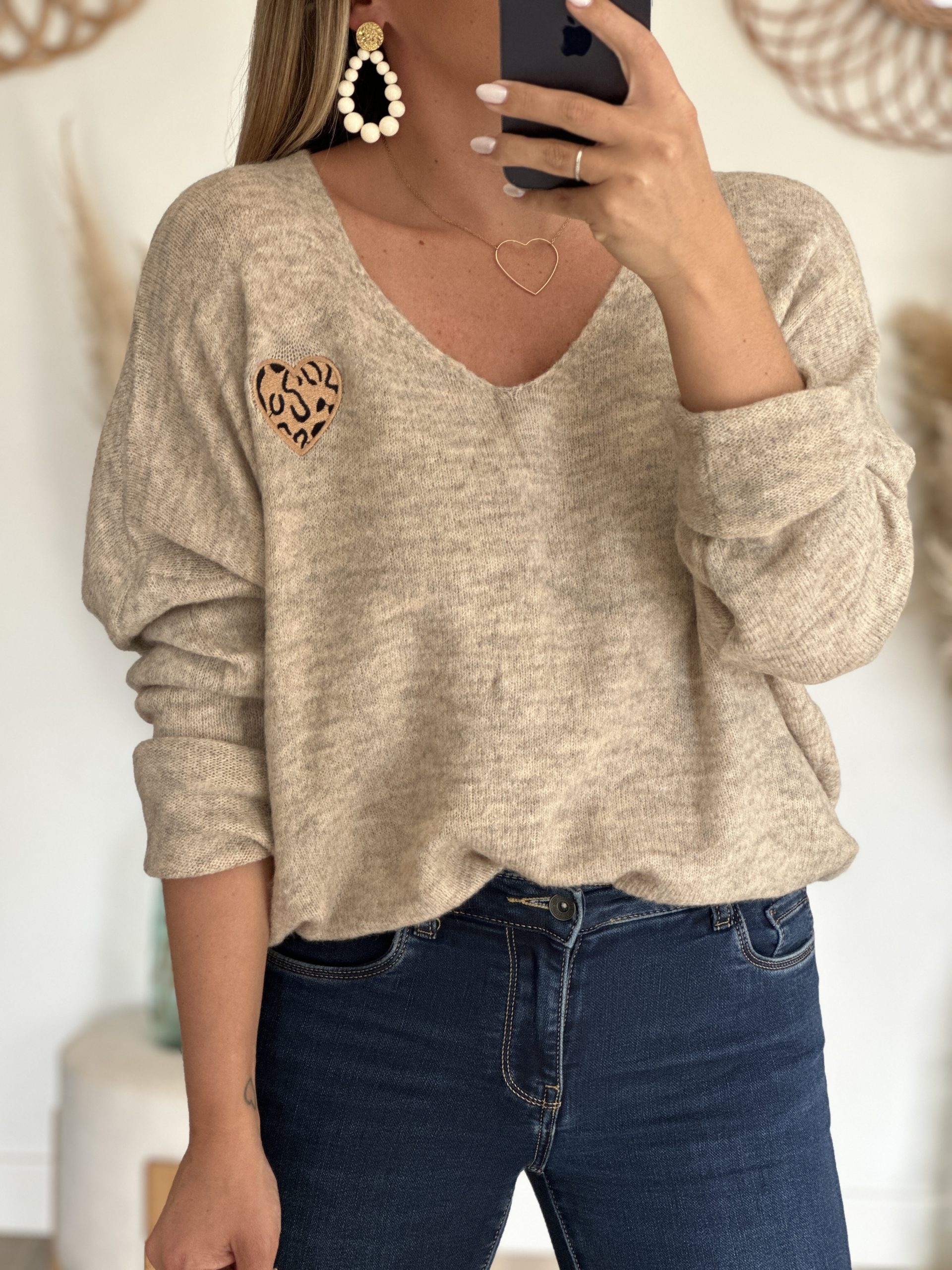 Accessoires portés par le mannequin : Boucles d’oreilles n*5 Crème, Collier grand coeur, Jean’s SOLY Brut