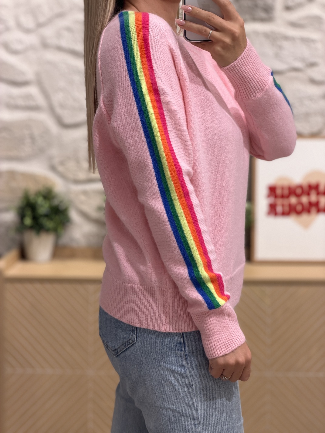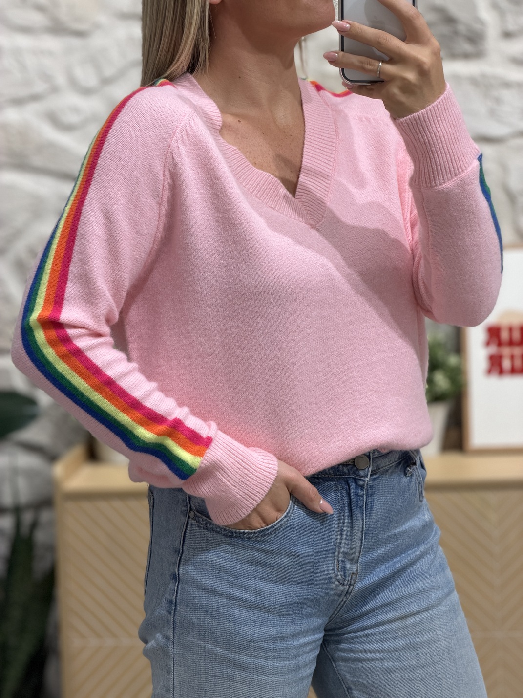 Pull MIOTO (Made in Italie) Pull Coloris : rose, fuchsia, orange, jaune & vert Col V Bandes arc-en-ciel sur les manches Manches longues Taille unique qui correspond du 36/S au 42/XL Longueur : 61 cm Largeur sous aisselles : 54 cm Composition : 42% acrylique, 30% nylon, 28% polyester Le modèle porte généralement du S/36 et mesure 1m65 Accessoires portés par le mannequin : Basket RISOTTO