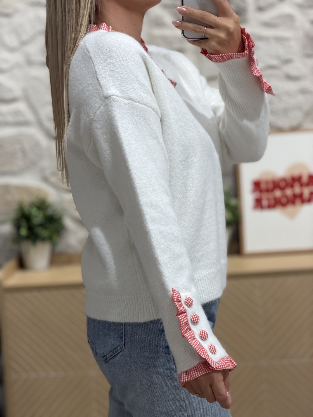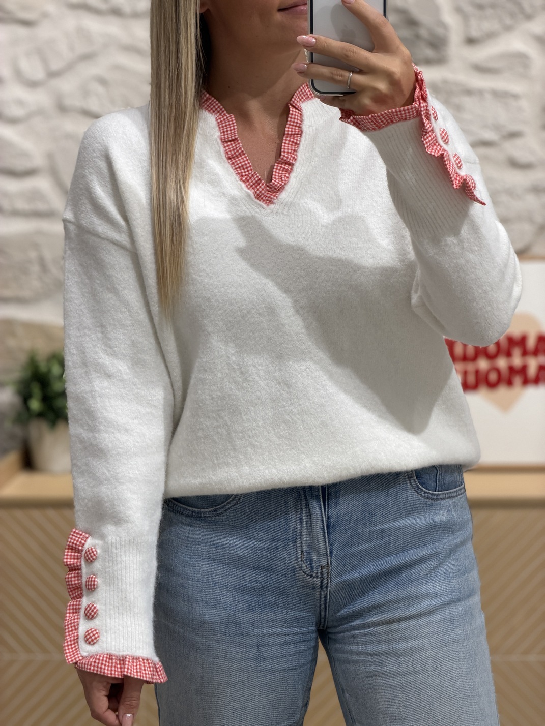 Pull SADIE – Blanc Pull Coloris : blanc & rouge Col V avec détails vichy Boutons et bout de manche imprimé vichy Très agréable à porter Manches longues Coupe droite Taille unique peut convenir du 36 au 42 Longueur : 59 cm Largeur sous aisselle : 54 cm Composition : 40% polyester, 28% polyamide, 20% acrylique, 12% laine Le modèle porte du S habituellement et mesure 1m65 Accessoires portés par le mannequin : Basket GASY