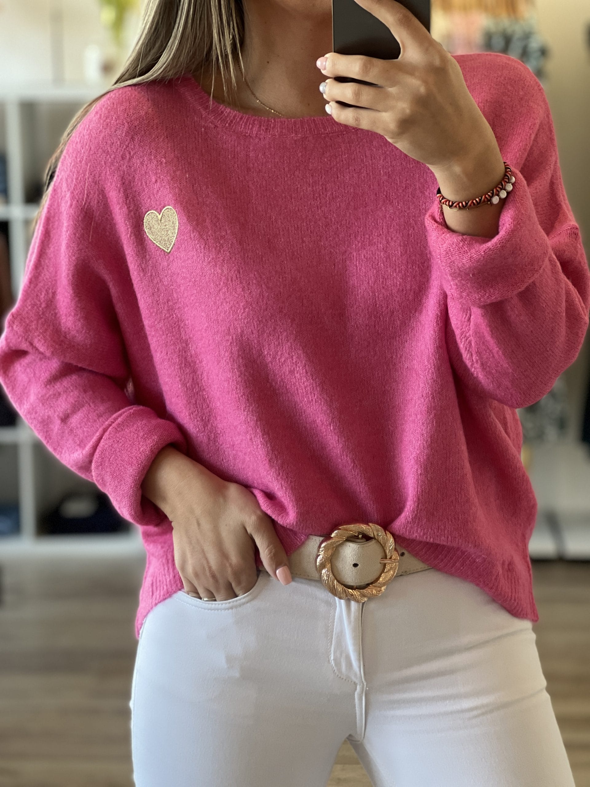 Pull ZELDA Fuchsia Coloris : Fuchsia & or Très agréable à porter Coupe loose Coeur or brodé Taille unique peut convenir du S au XL Composition : 60% viscose, 15% laine, 12% polyester, 10% nylon, 3% élasthanne Le modèle porte du S habituellement et mesure 1m65