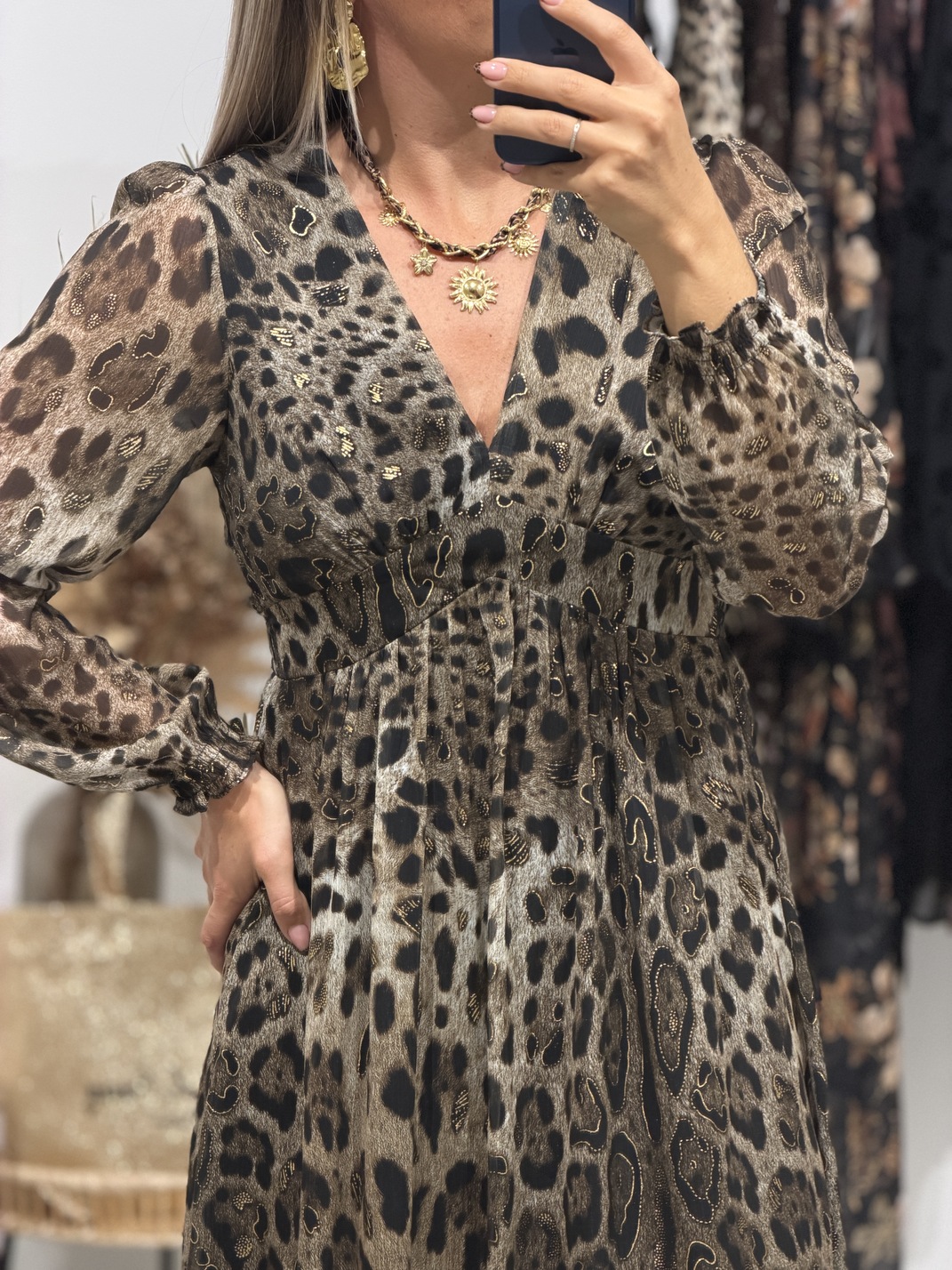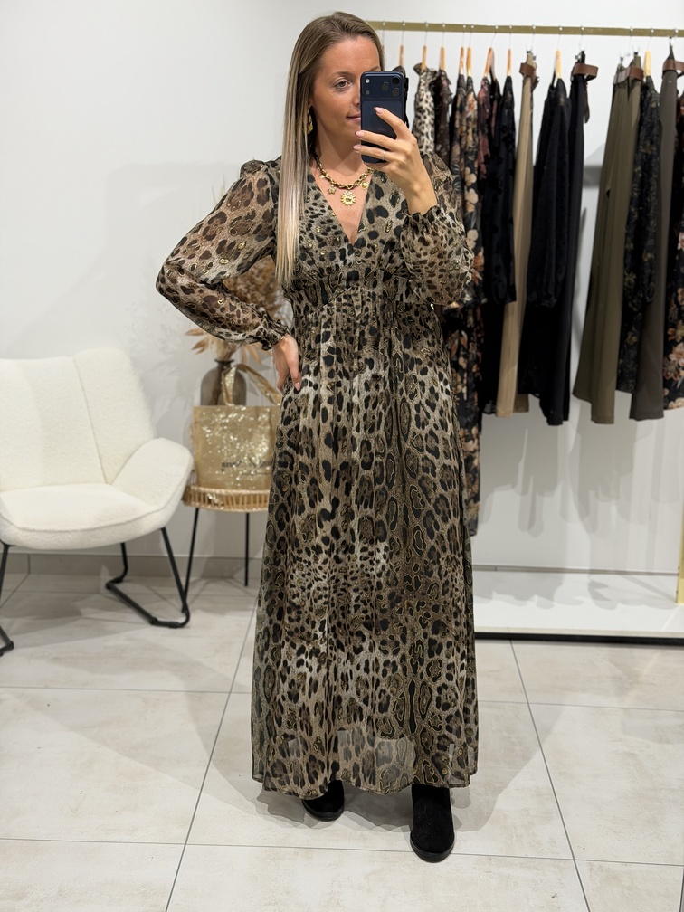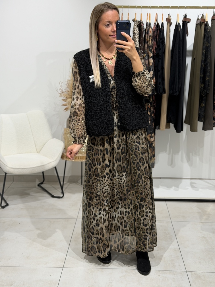 Robe BIANCA Robe Coloris : noir, taupe & or Imprimé léopard Manches longues Coupe empire Col V avec bandeau S’adapte aux femmes enceintes Doublée Manches longues Tailles = S/M/L Longueurs = S : 130 cm, M : 131 cm, L : 132 cm Largeurs sous aisselles = S : 42 cm, M : 44 cm, L : 46 cm Composition : 100% polyester Le modèle porte du S et mesure 1m65 Accessoires portés par le mannequin : Bottes SANTIAGO Noire, Gilet sans manches MORANE Noir