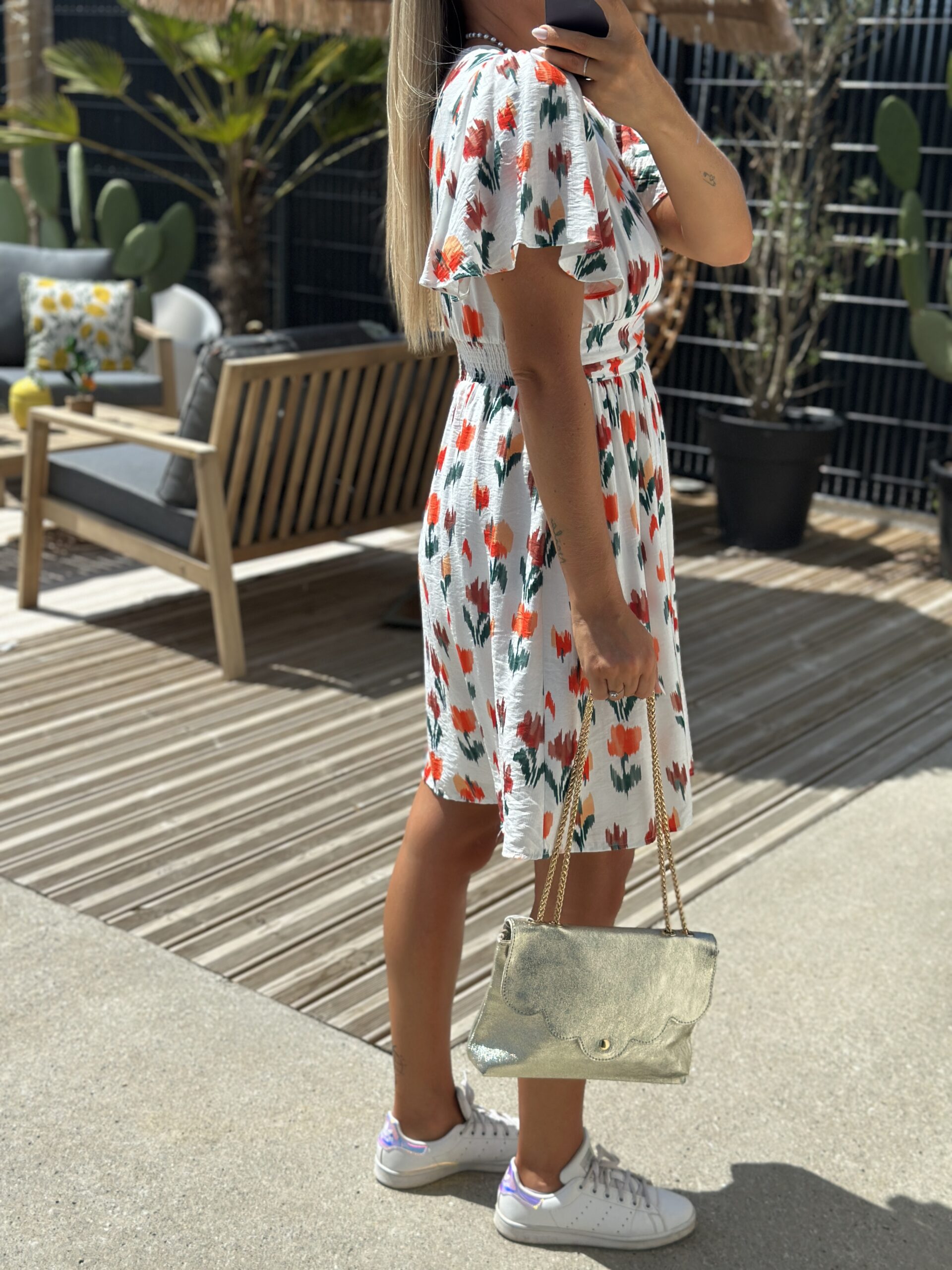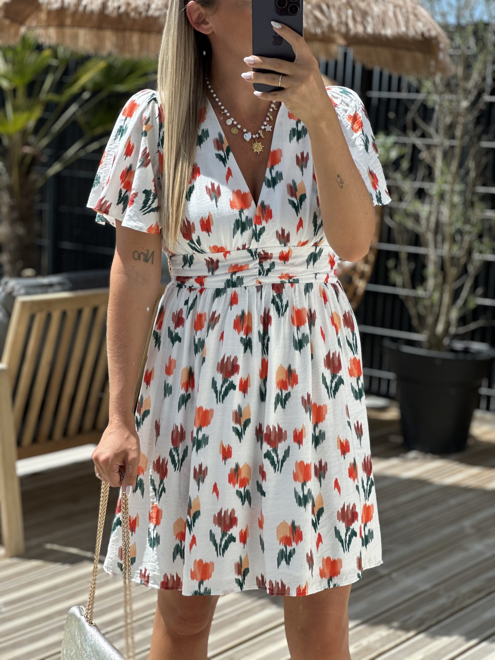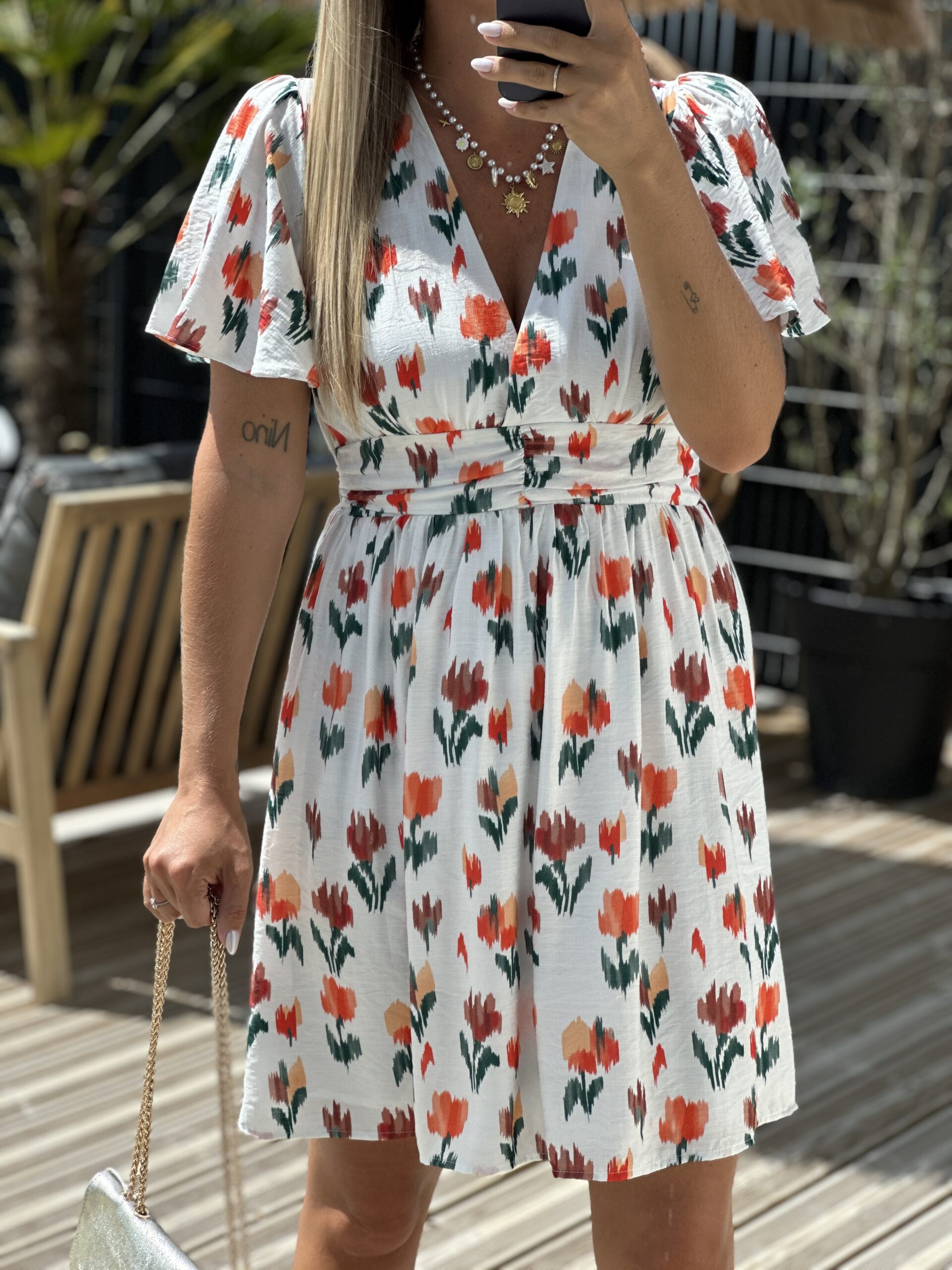 Robe FOY CURVY Robe Coloris : blanc, orange, marron & vert Col V avec bandeau Coupe empire Imprimé fleuri Manches courtes volantes Doublée S’adapte aux femmes enceintes Tailles = L : 40, XL : 42, 2XL : 44, 3XL : 46, 4XL : 48 Longueurs = L : 91 cm, XL : 92 cm, 2XL : 93 cm, 3XL : 94 cm, 4XL : 95 cm Largeurs sous aisselles = L : 41 cm, XL : 43 cm, 2XL : 45 cm, 3XL : 47 cm , 4XL : 49 cm Composition : 91% viscose, 9% polyamide Le modèle porte…
