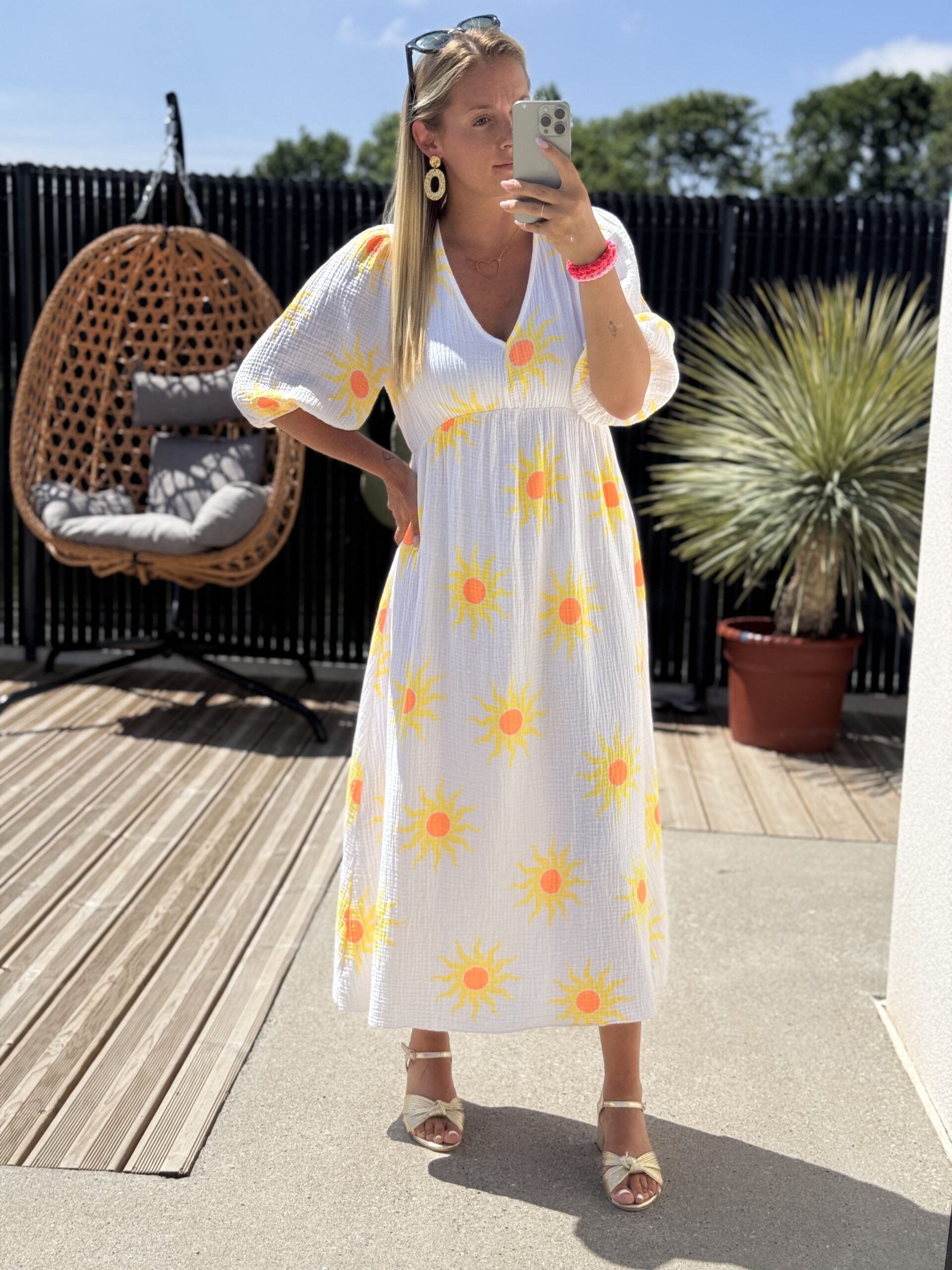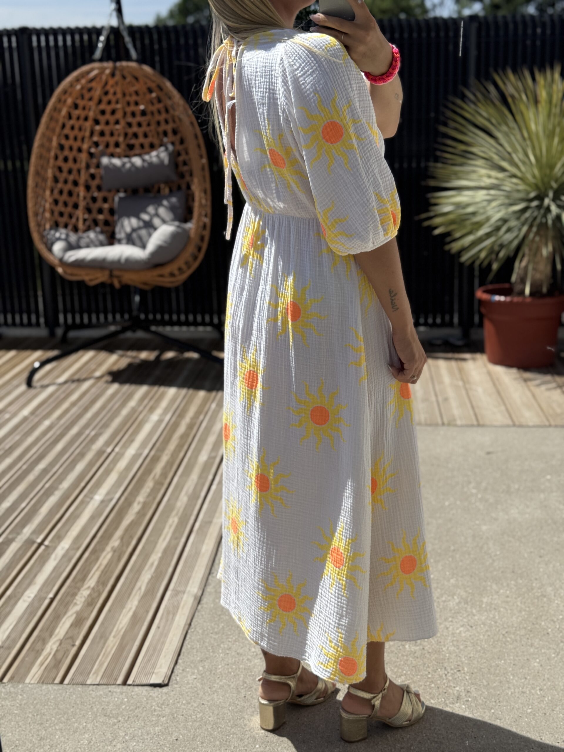 Robe JUDY (Made in Italie) Robe Coloris : blanc, jaune & orange Gaze de coton Manches longues Coupe évasée Imprimé soleil Taille unique peut convenir du 36 au 42/44 Composition : 100% coton Le modèle porte du S/36 habituellement et mesure 1m65