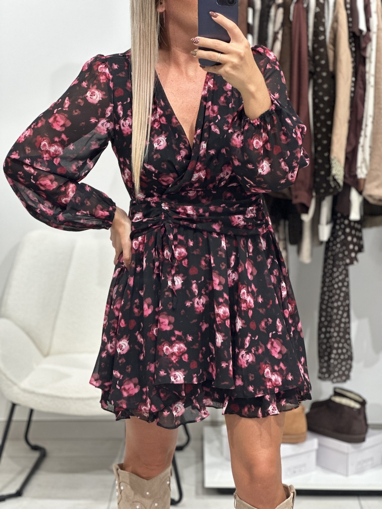 Robe LINDY Robe Coloris : noir & rose Col cache-coeur avec pression Doublée Manches longues Volants sur le bas Imprimé fleuri S’adapte aux femmes enceintes Tailles = S : 36, M : 38, L : 40 Longueurs = S : 85 cm, M : 86 cm, L : 88 cm Largeurs sous aisselles = S : 45 cm, M : 47 cm, L : 50 cm Composition : 100% polyester Le modèle porte du S et mesure 1m63