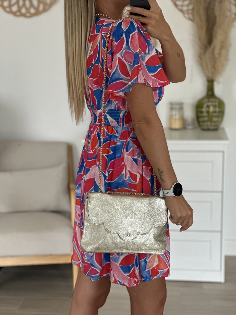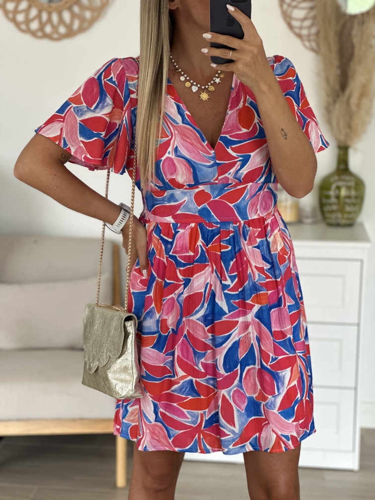 Robe LOUP – Bleue Robe Coloris : rose, rouge, blanc & bleu Motif fleuri Col V Élastique à l’arrière de la taille, bandeau sur le devant Coupe empire Manches courtes volantes Doublée S’adapte aux femmes enceintes Longueurs = S/M : 87 cm, M/L : 88 cm Largeurs sous aisselles = S/M : 45 cm, M/L : 47 cm Composition : 80% viscose, 20% polyamide Le modèle porte du S/M et mesure 1m65