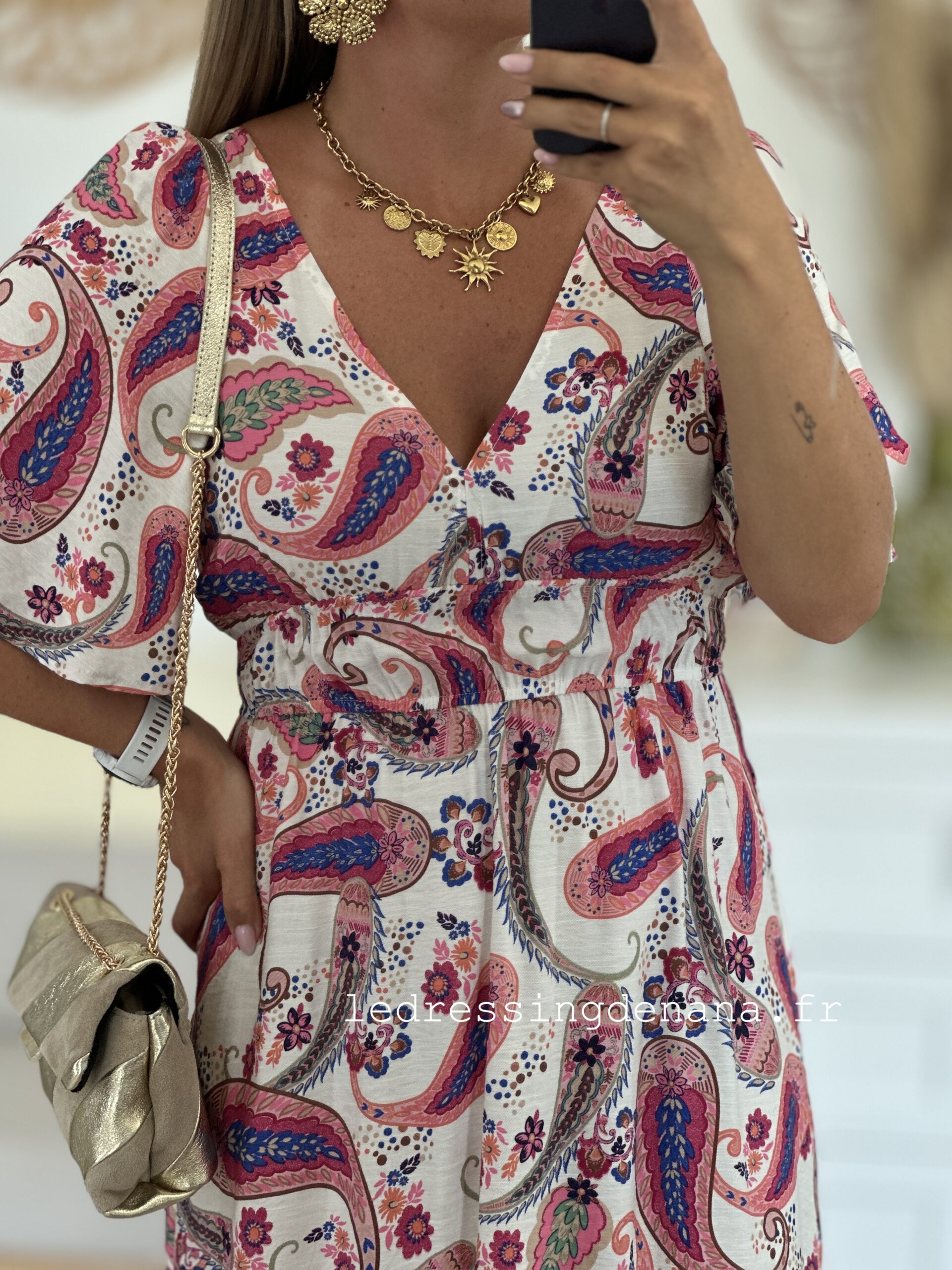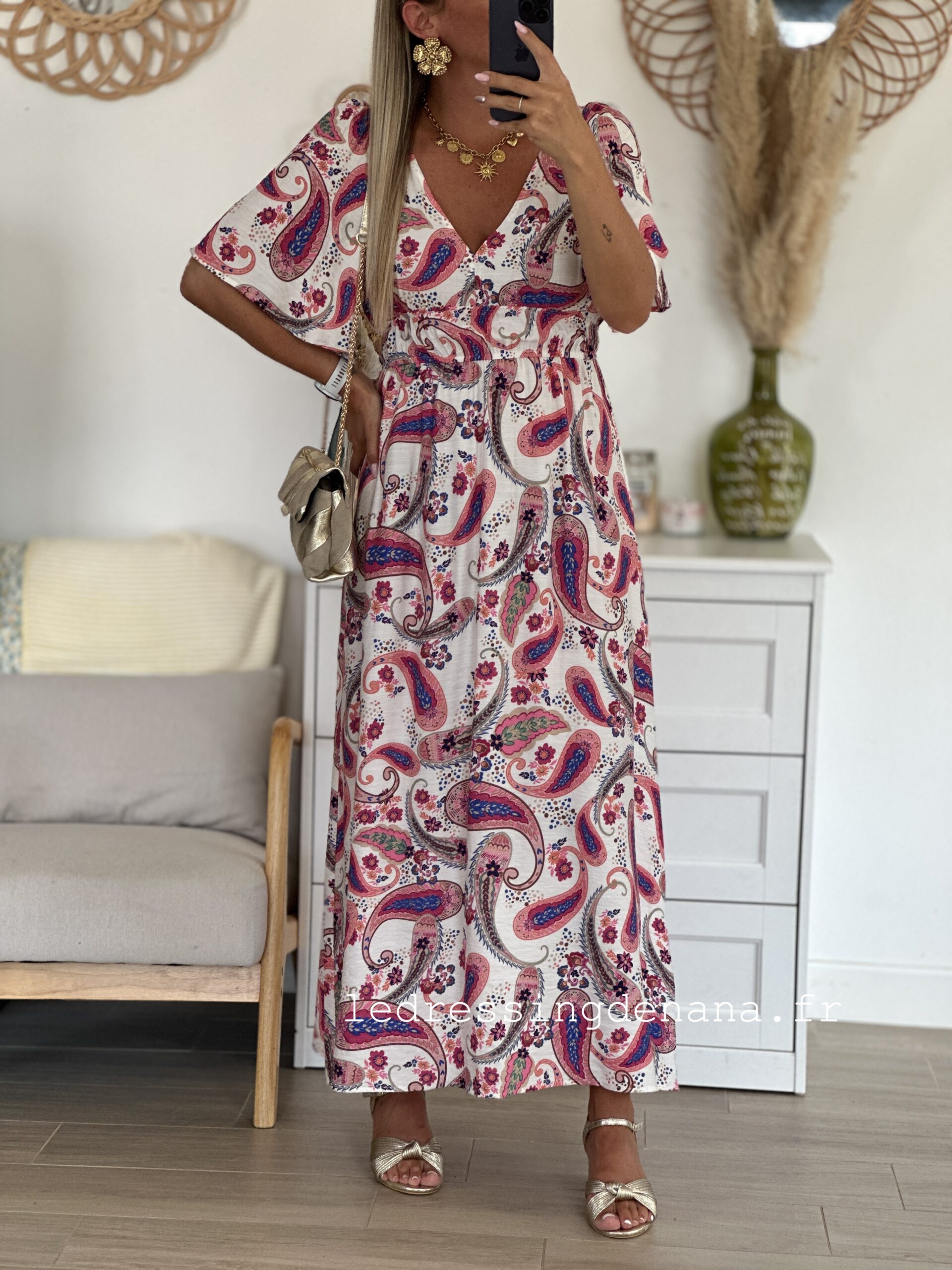 Robe MARCUS Robe Coloris : écru, taupe, rose, bordeaux & blanc Col V Bandeau sous la poitrine Manches courtes volantes Motif cachemire Tailles = S : 36, M : 38, L : 40 Longueurs = S : 131 cm, M : 132 cm, L :133 cm Largeurs sous aisselles = S : 40 cm, M : 42 cm, L :44 cm Composition : 83% viscose, 17% polyamide Le modèle porte du S/M et mesure 1m65 Accessoires portés par le mannequin : Sac ARSENAL, Sandales ILONA, Collier 42
