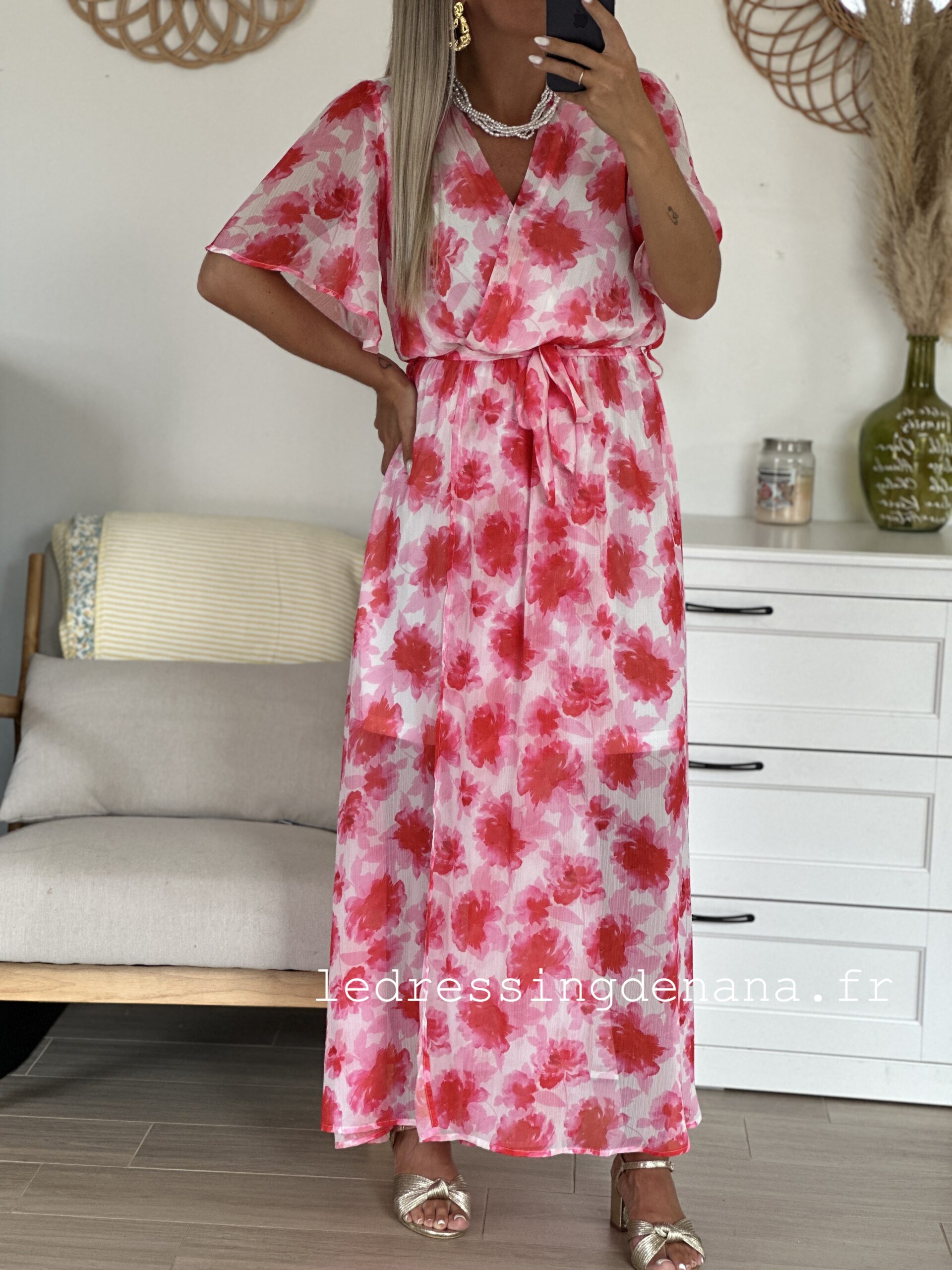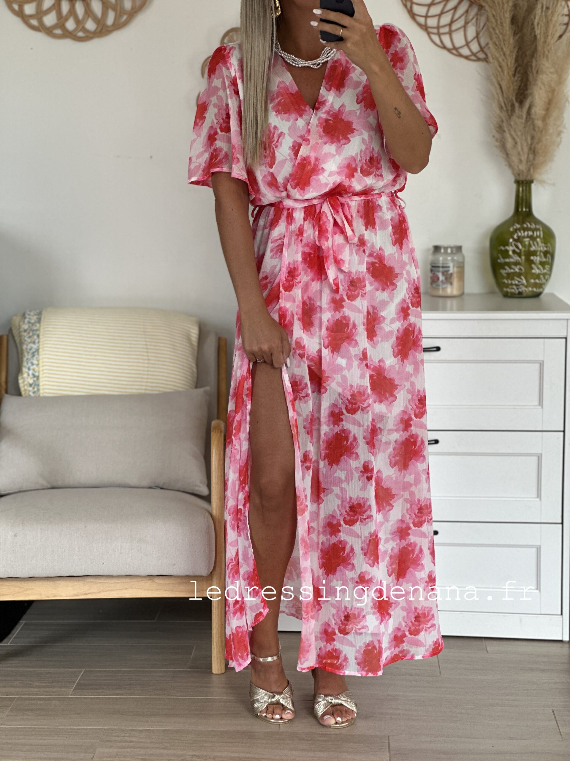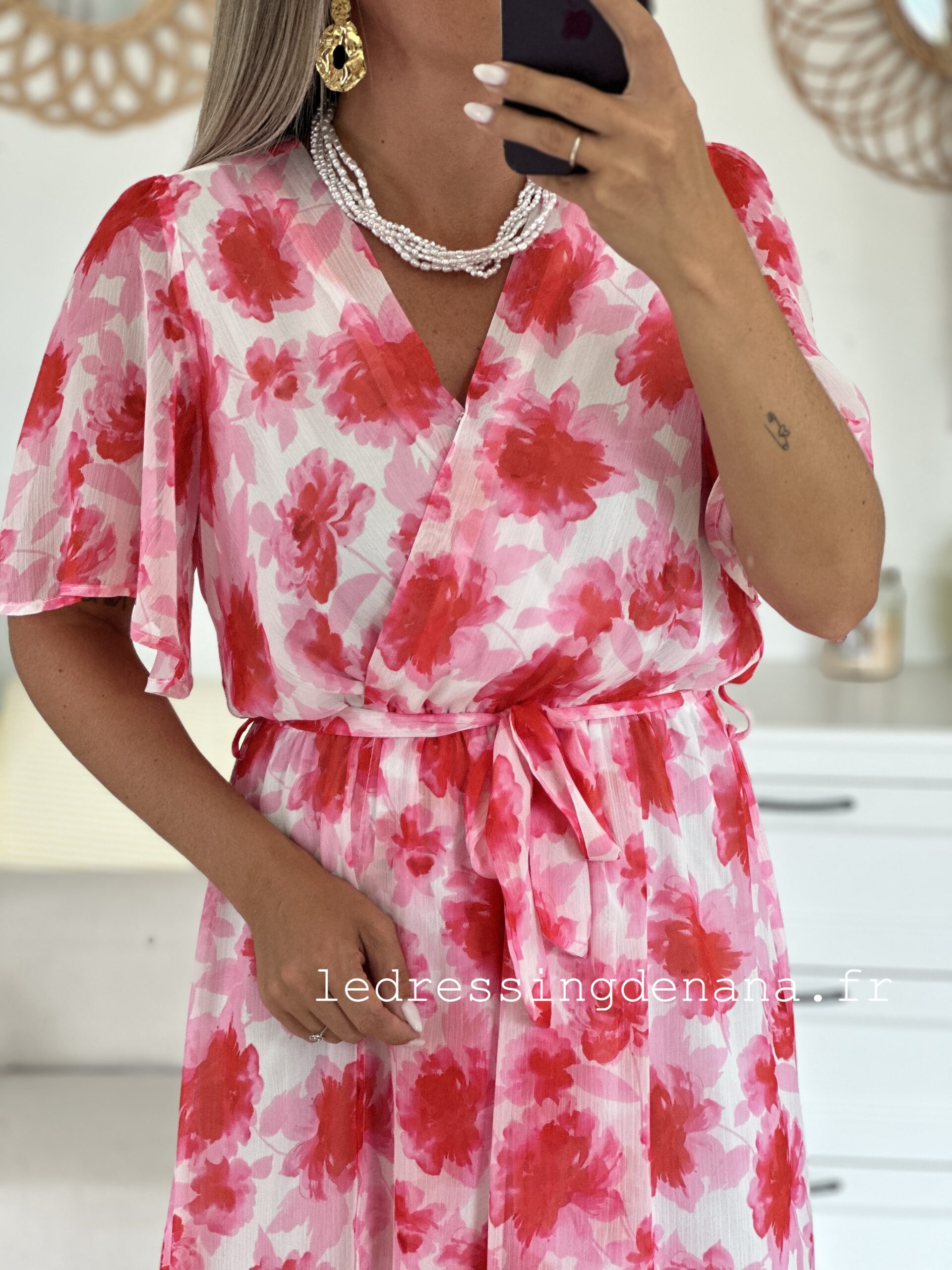 Robe NATAO Robe Coloris : rose, rouge & blanc Imprimé fleuri Col V avec pression Élastique à la taille avec ceinture Doublée jusqu’aux genoux Manches courtes S’adapte aux femmes enceintes Tailles = S : 36, M : 38, L : 40 Longueurs = S : 143 cm, M : 144 cm, L : 145 cm Largeurs sous aisselles = S : 46 cm, M : 48 cm, L : 50 cm Composition : 100% polyester Le modèle porte du S et mesure 1m63
