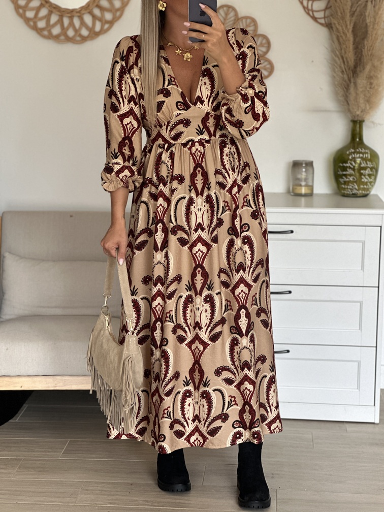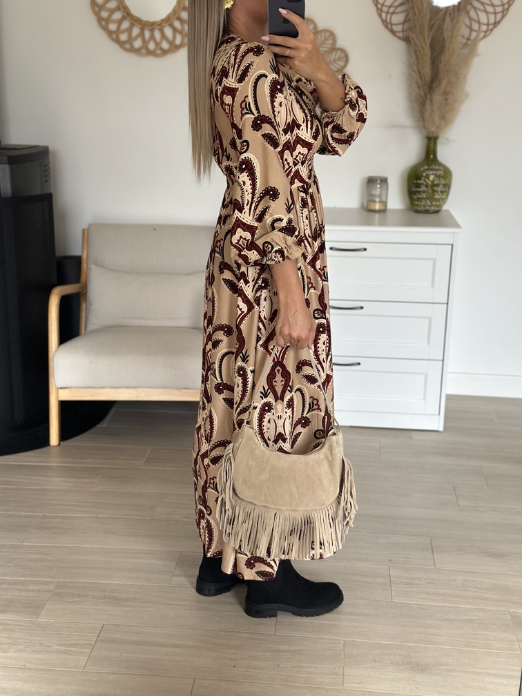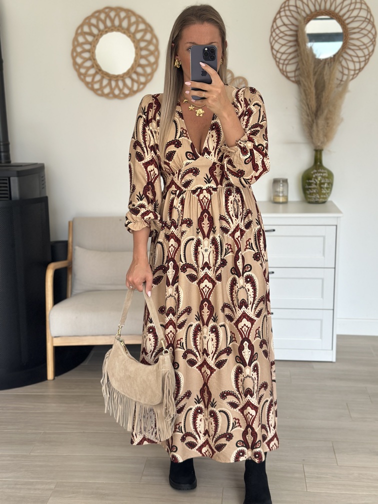 Robe NINIO Robe Coloris : beige, bordeaux, écru & noir Motif cachemire Manches longues Coupe empire Décolleté en V Tailles = S/M : 36/38, M/L : 38/40 Longueurs = S/M : 133 cm, M/L : 134 cm Largeurs sous aisselles = S/M : 43 cm, M/L : 45 cm Composition : 70% viscose, 30% polyamide Le modèle porte du S/M et je mesure 1m65