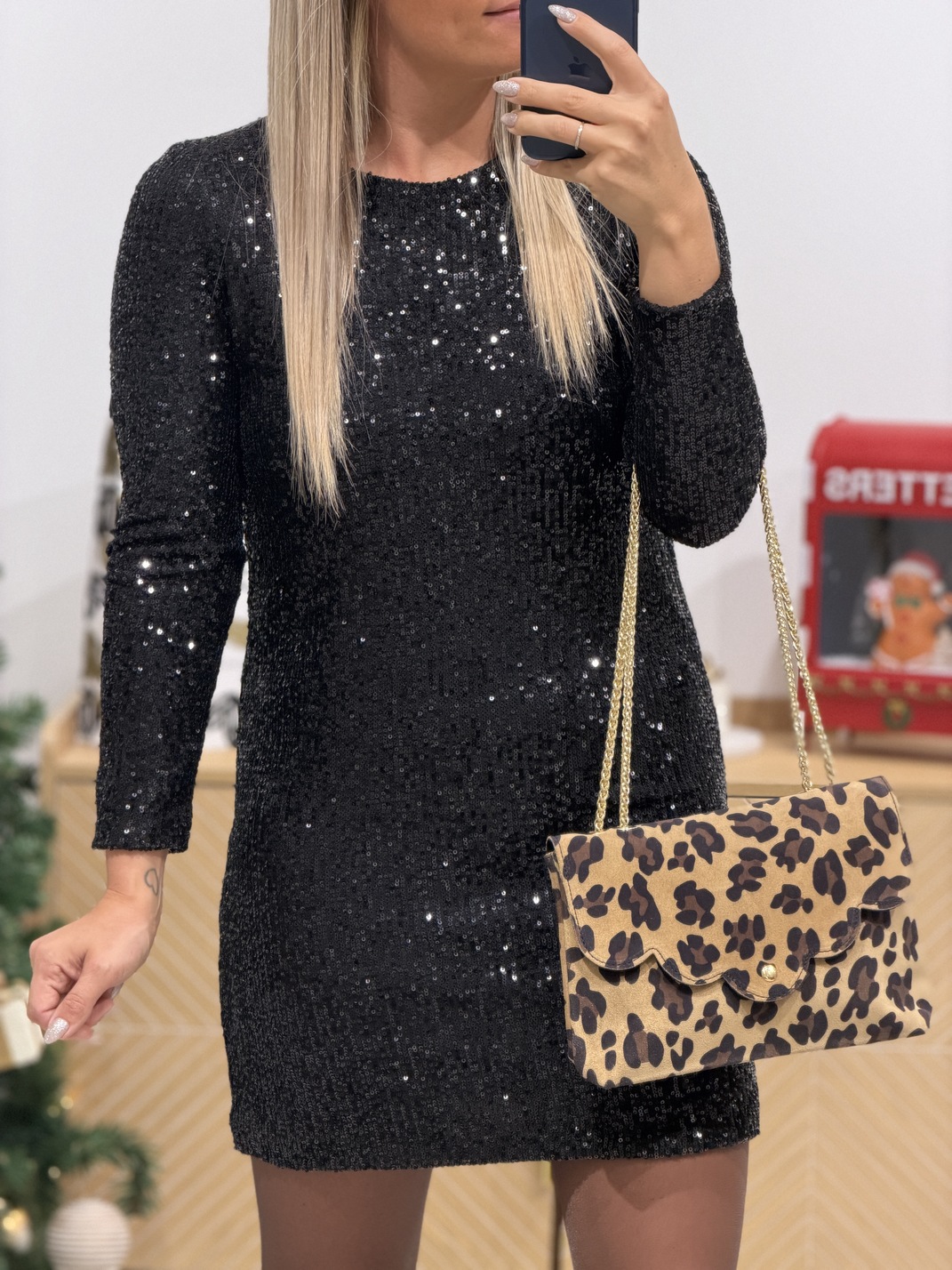Robe SEQUIN NOIR Robe Couleur : Noir Coupe droite Manches longues Sequins noirs Fermeture dans le dos Doublée Ne pique pas Tailles = S : 36, M : 38, L : 40 Longueurs = S : 85 cm, M : 86 cm, L : 87 cm Composition : 100% polyester Le modèle mesure 1m65 et porte du S Accessoires portés par le mannequin : Sac BENODET Léopard, Bottines EUDORA noir