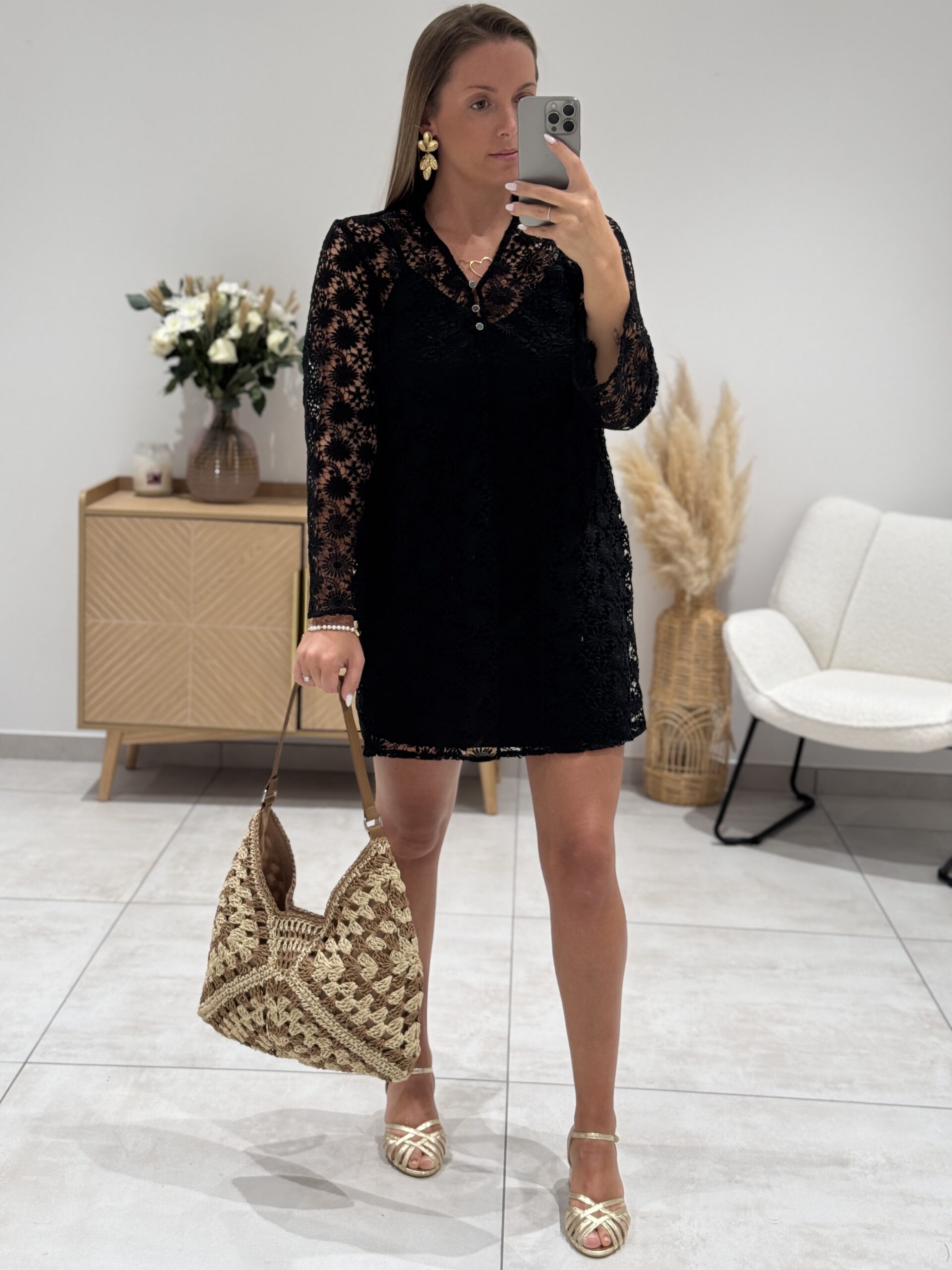 Robe UKY Noire Robe Couleur : noire Broderie anglaise Manches longues ajourées Coupe droite Col V avec petits boutons Doublée sur la longueur Tailles = S : 36, M : 38, L : 40 Longueurs = S : 85 cm, M : 86 cm, L : 87 cm Largeurs sous aisselles = S : 47 cm, M : 50 cm, L : 53 cm Composition : 60% polyester, 40% coton Le modèle porte du S et mesure 1m65 Accessoires portés par le mannequin : Boucles d’oreilles 251, Sandales PORTO-RICO, Collier double coeur or, Sac ROUKY, Bracelet 13