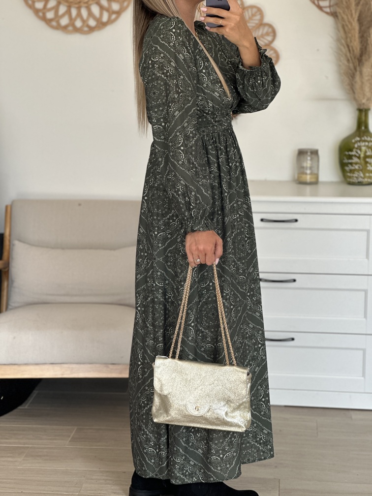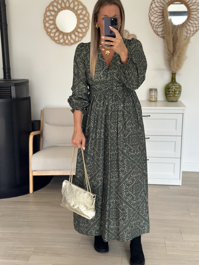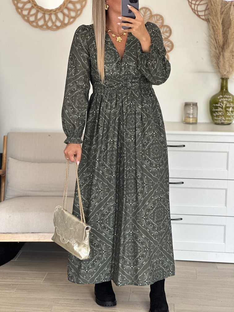 Robe WARVIN Robe Coloris : kaki, blanc & noir Motif cachemire Manches longues Coupe empire Décolleté en V Tailles = S/M : 36/38, M/L : 38/40 Longueurs = S/M : 134 cm, M/L : 136 cm Largeurs sous aisselles = S/M : 41 cm, M/L : 43 cm Composition : 80% viscose, 20% polyamide Le modèle porte du S/M et je mesure 1m65