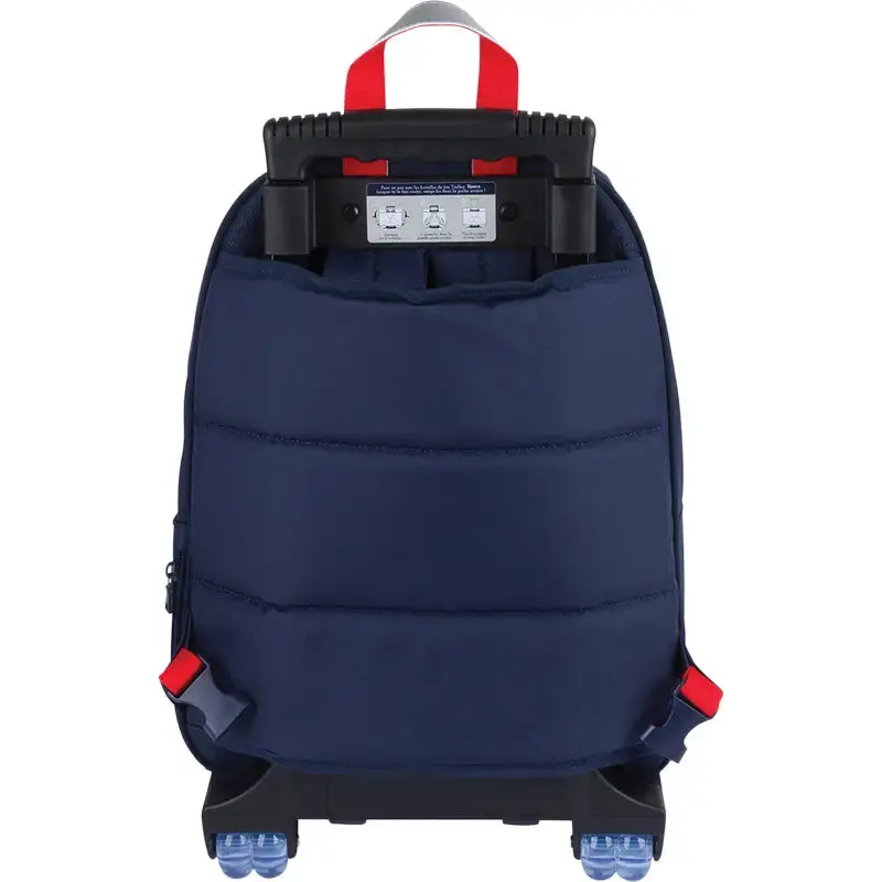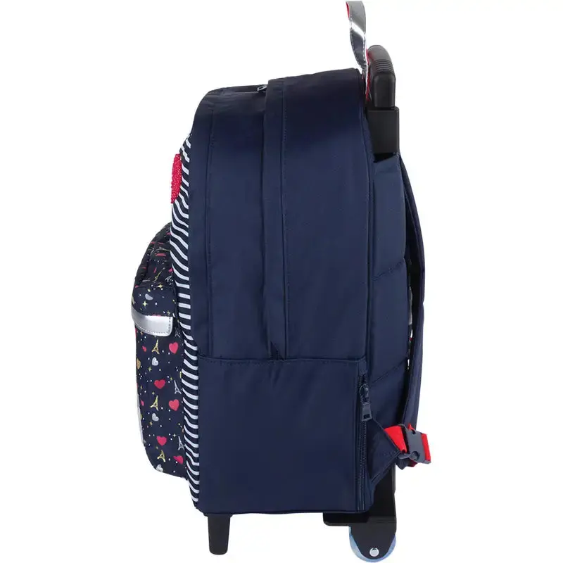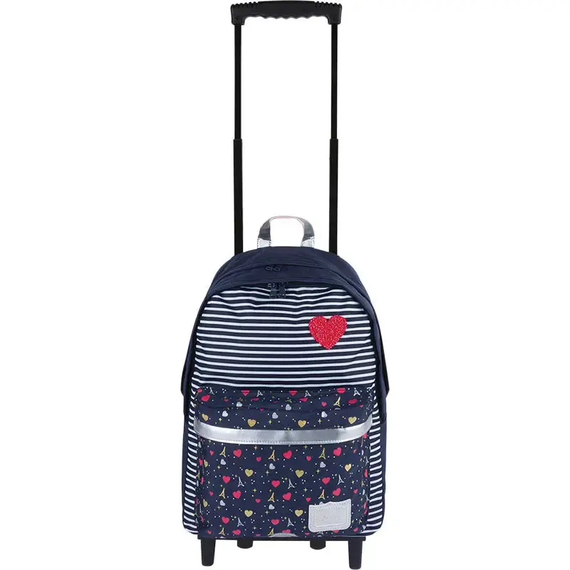 Le Sac à Dos Roulettes Tann’s « Emilie » est conçu pour les **élèves du CP au CM2**, alliant **design parisien, confort et solidité**. Son motif rayé bleu marine, son **patch cœur en bouclette avec fil lurex** et sa **sérigraphie dorée et argentée sur la poche**, inspirée du **thème Paris**, lui confèrent une **touche chic et intemporelle**.