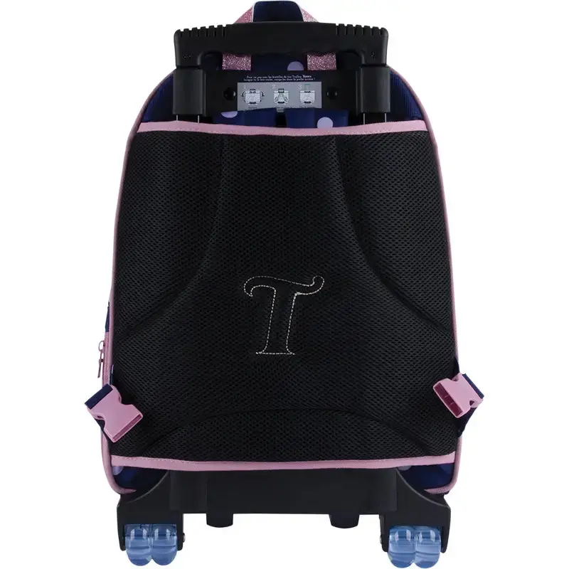 Le Sac à Dos Roulettes Tann’s « Romy » est conçu pour les **élèves du CP au CM2**, offrant **solidité, confort et un style unique**. Son bleu marine élégant, parsemé de petits pois roses, ses **ornements pailletés** et ses **tirettes de zip ornées de pompons colorés en tulle** lui confèrent une **touche chic et tendance**.