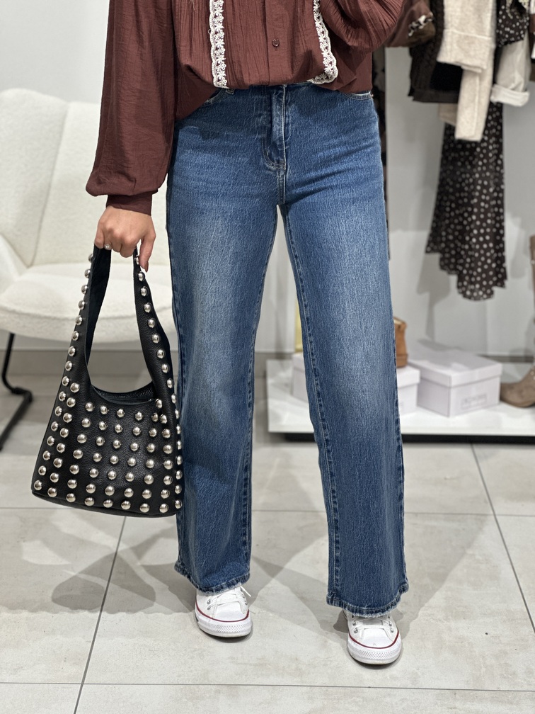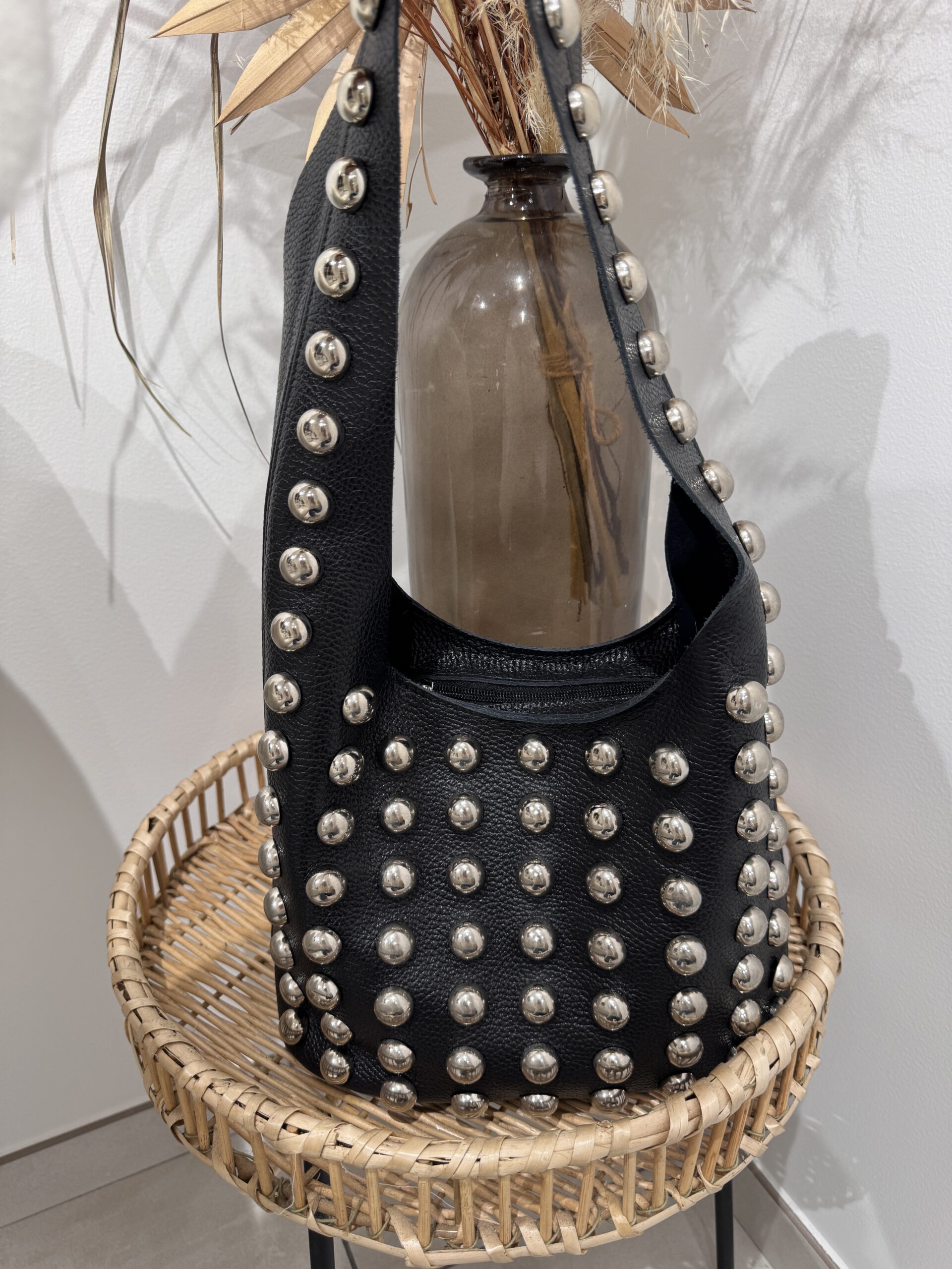 Sac PERRY Sac en cuir Coloris : Noir Clous argenté Peut se porter à la main & à l’épaule Taille : 20 x 27 cm