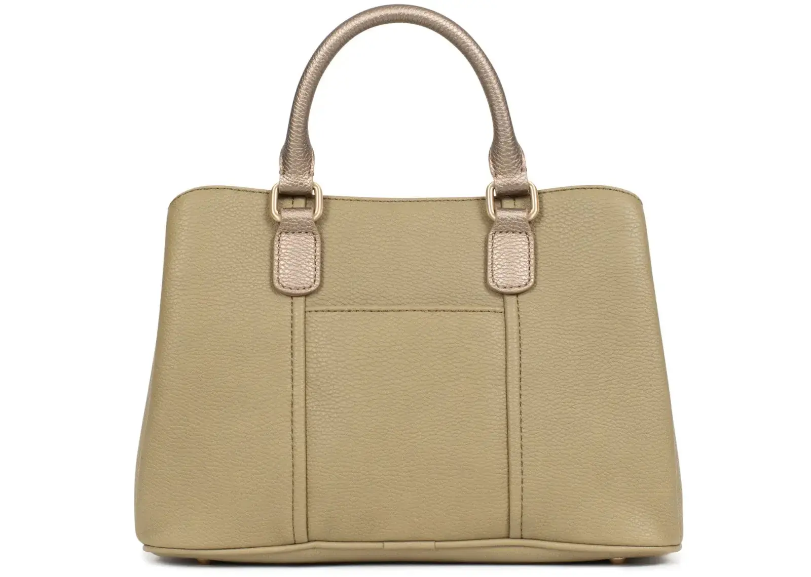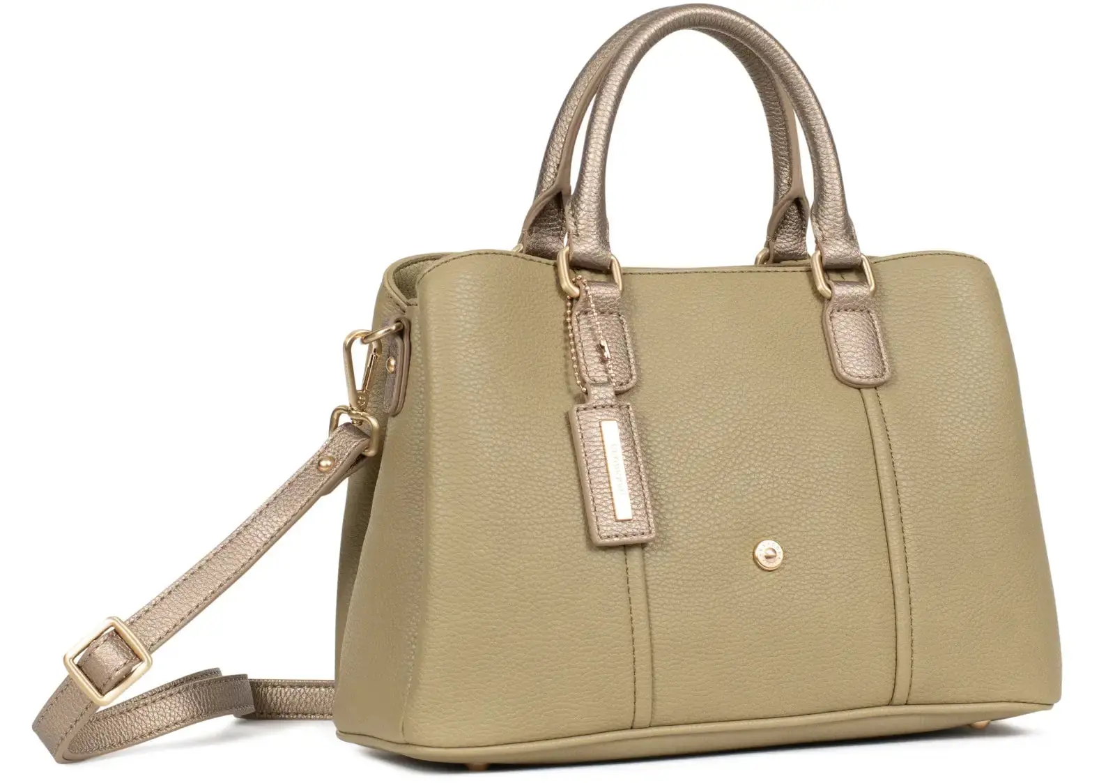 Le Sac porté main Hexagona « Abi » allie élégance et durabilité grâce à sa conception en matière recyclée. Sa texture en synthétique grainé (45% Synthétique, 40% Polyester recyclé, 15% Polyuréthane recyclé) assure une finition haut de gamme tout en respectant une démarche éco-responsable. Ses finitions or brossé lui apportent une touche sophistiquée, idéale pour sublimer vos tenues.