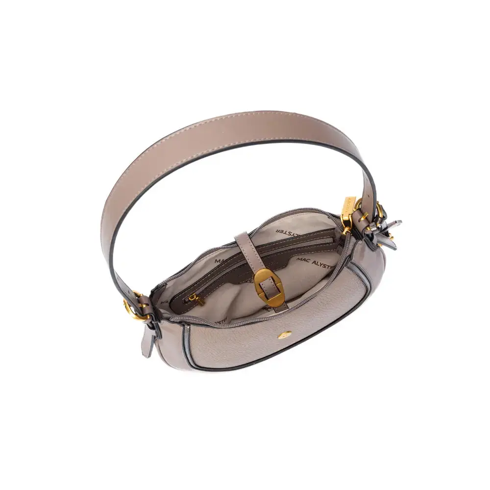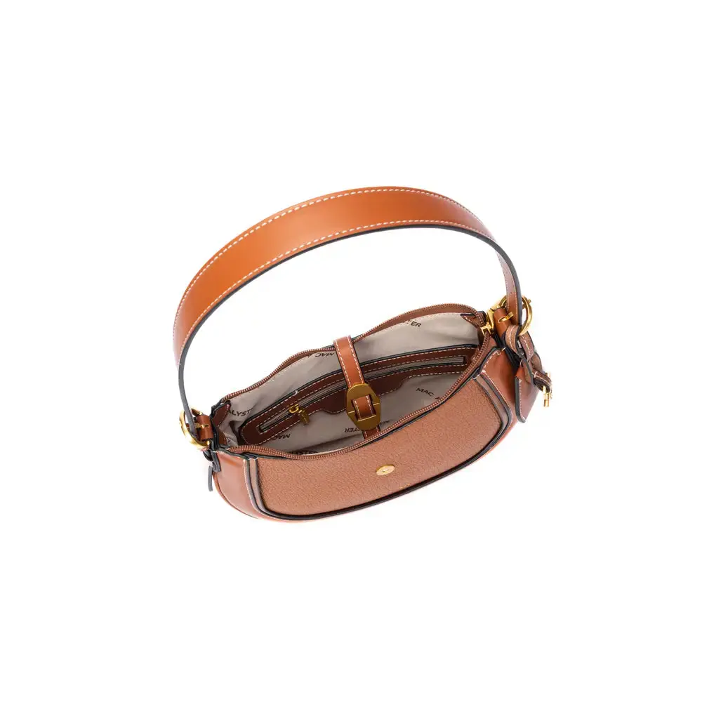 Le sac besace Mac Alyster « Bagatelle » en format compact est la pièce parfaite pour celles qui aiment voyager léger tout en conservant une touche d’élégance. Inspiré des modèles vintage, il associe une forme incurvée tendance à une matière effet cuir grainé et de jolies finitions dorées, dont une boucle décorative centrale et un cadenas signature.