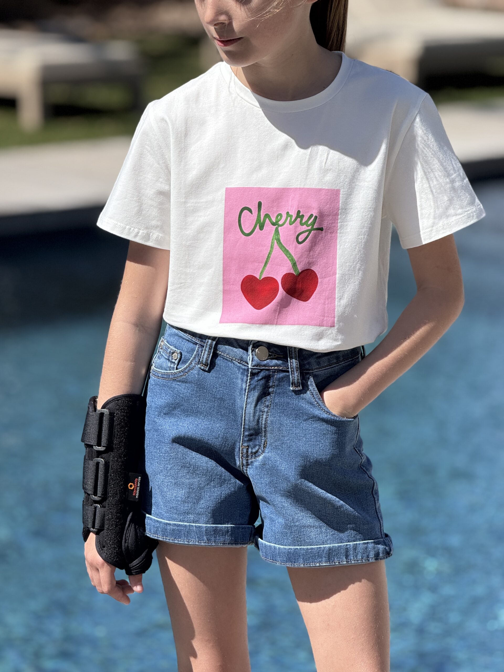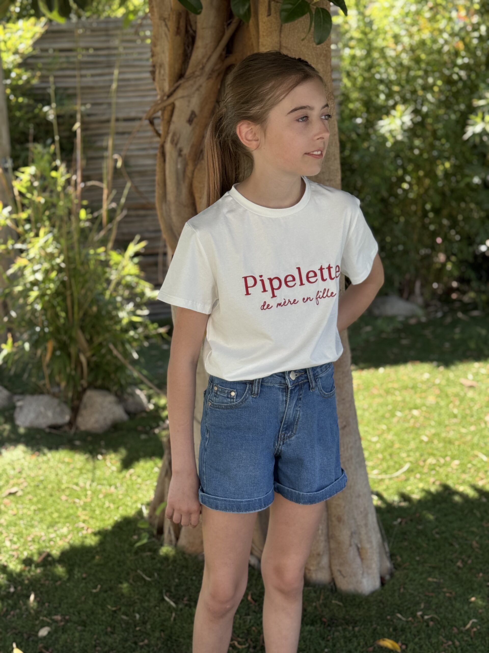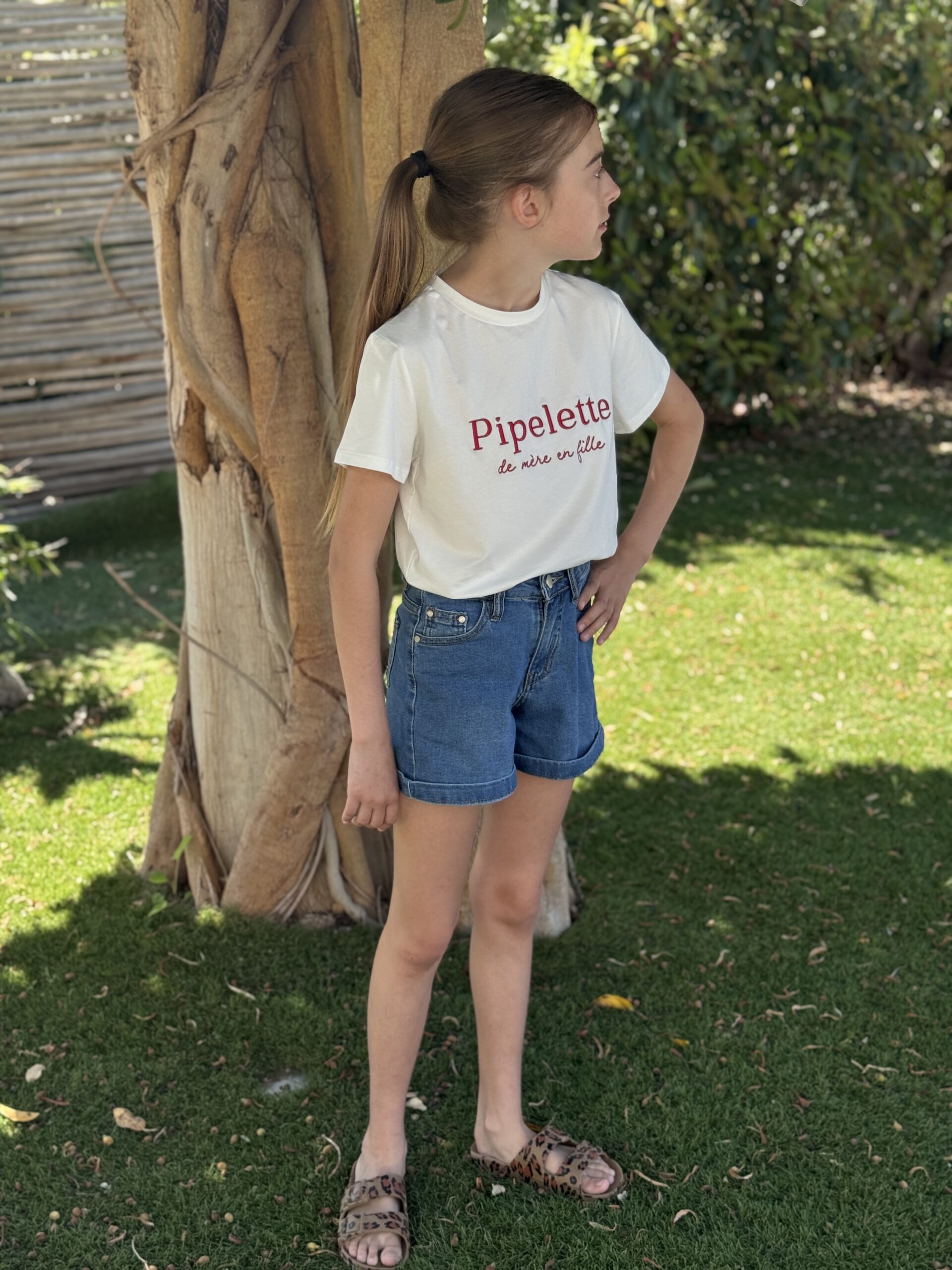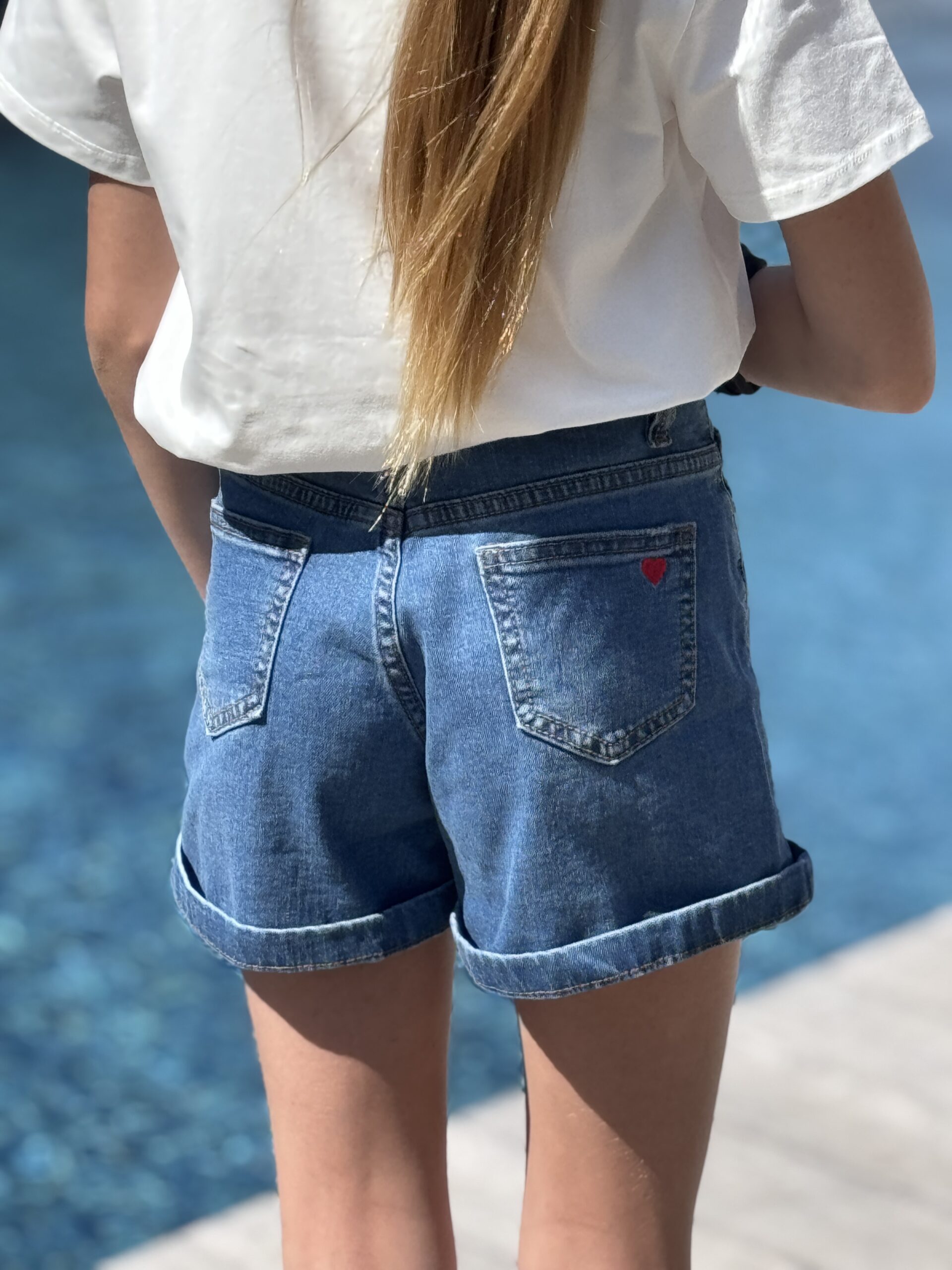 Short KLOÉ Jean’s foncé – Kids Short Couleur : jean’s foncé Coupe droite Coeur rouge sur la poche arrière Composition : 98% coton, 2% élasthanne Le modèle porte du 10 ans et mesure 1m43