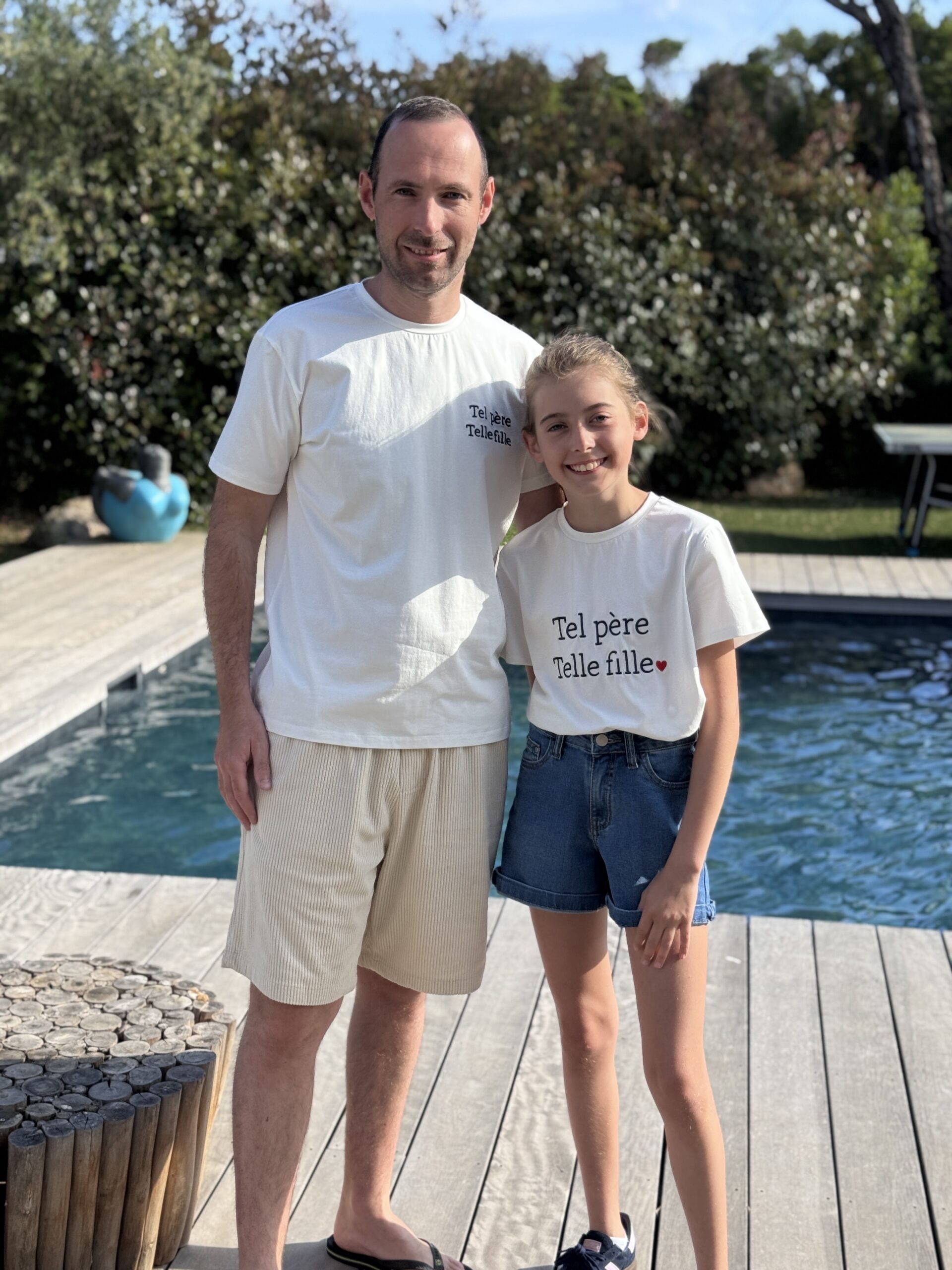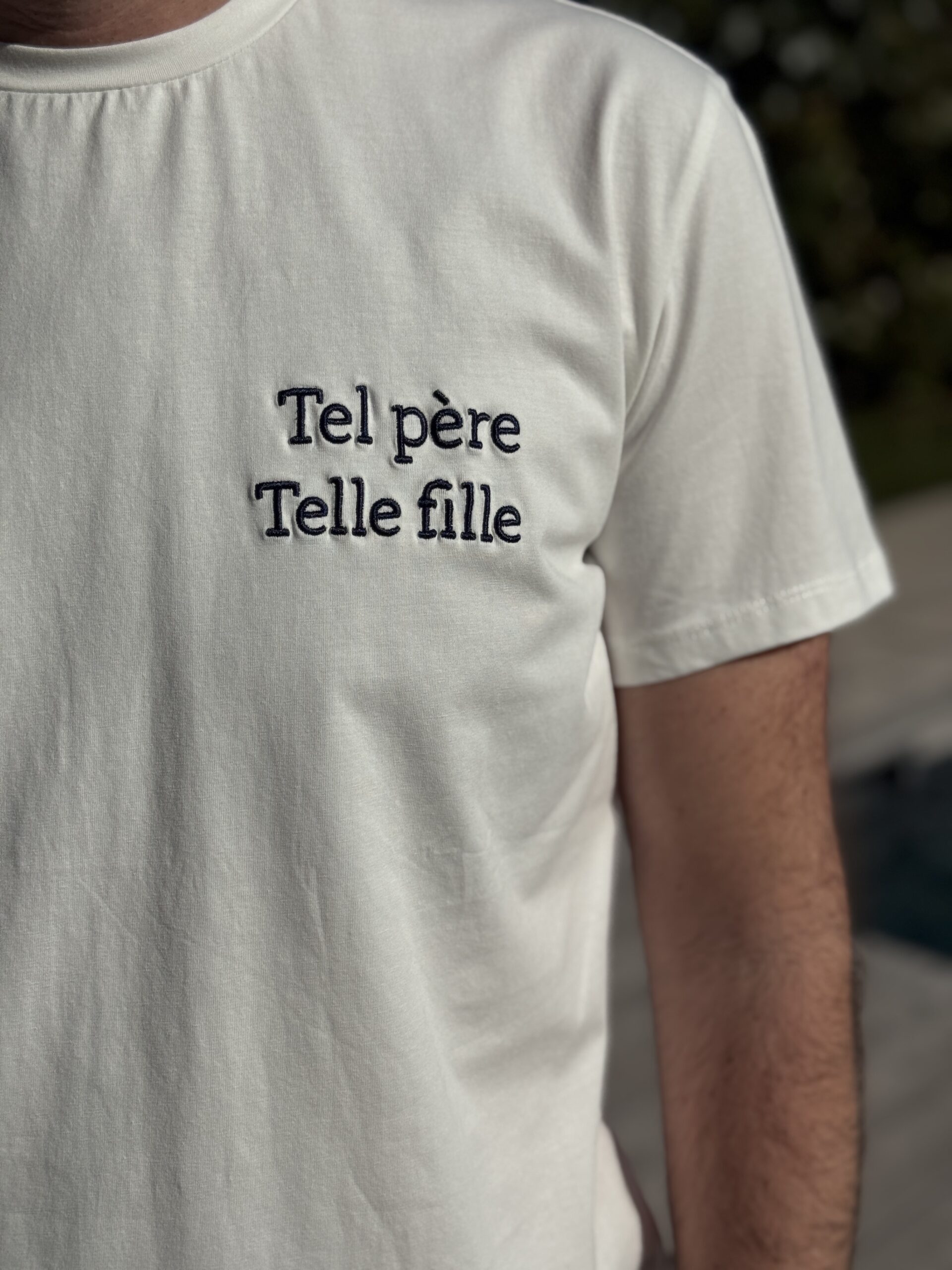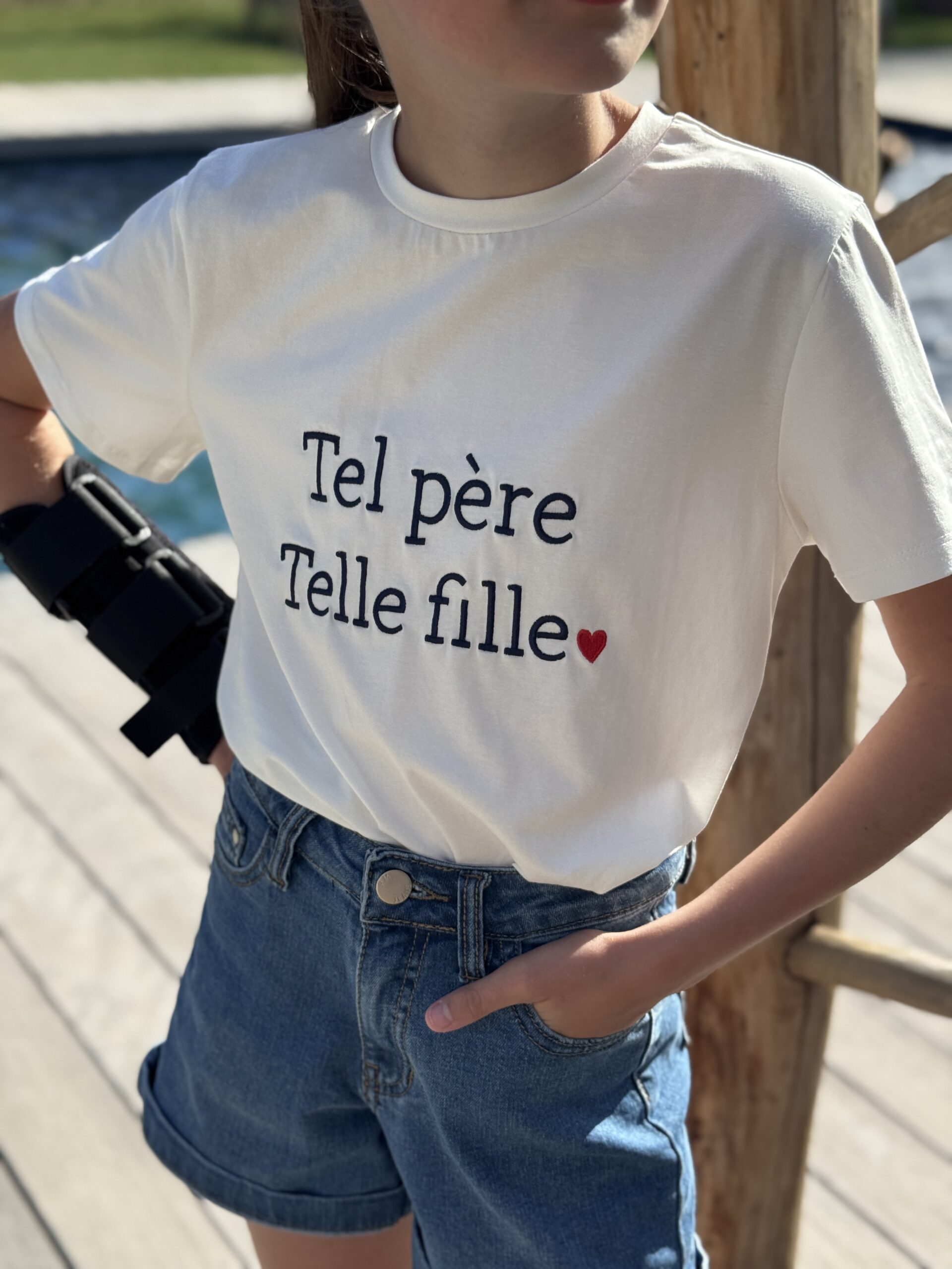 T-shirt Tel père, telle fille Blanc KIDS T-shirt Coloris : blanc & marine Col rond Inscription » Tel père, telle fille » avec un petit coeur brodé Manches courtes Coupe loose Tailles = 2/3 ans, 4 ans, 6 ans, 8 ans, 10 ans, 12 ans Composition : 95% coton et 5% spandex Le modèle porte du 10 ans et mesure 1m40