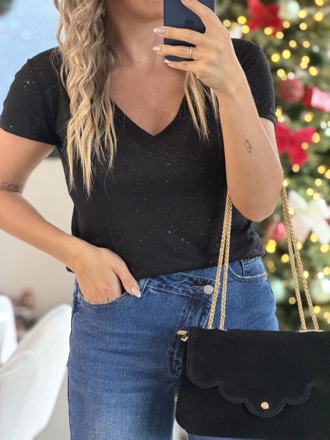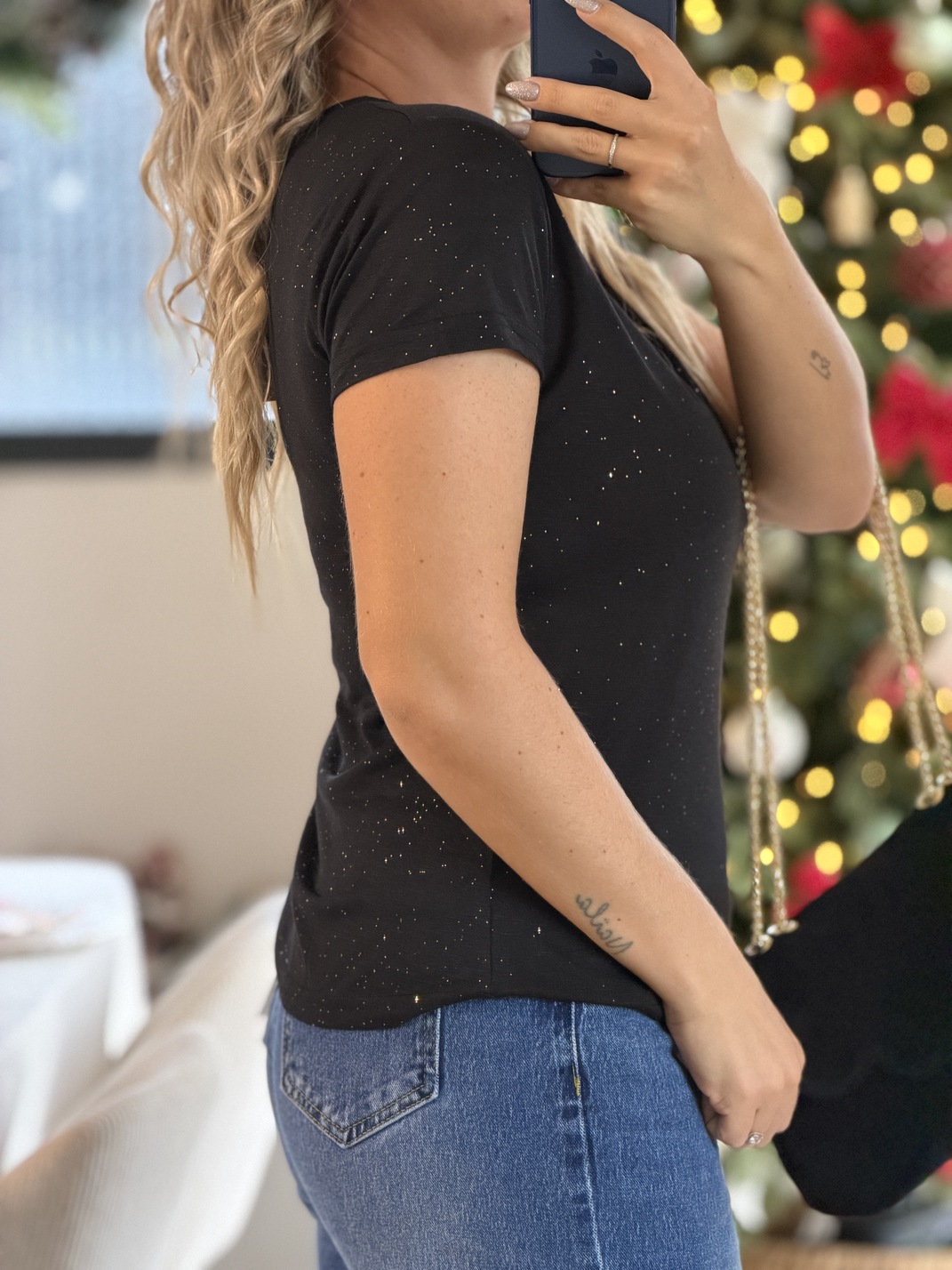T-shirt THÉA CURVY T-shirt Couleur : noire Col V Manches courtes Irisé Tailles = XL/42, XXL/42/44 , XXXL/44/46 Longueur = XL : 61 cm, XXL : 62 cm, XXXL : 63 cm Largeur sous aisselles = XL: 49 cm, XXL : 50 cm, XXXL : 51 cm Composition : 100% polyester Le modèle porte du S/M et mesure 1m65 Accessoires portés par le mannequin : Sac BENODET Noir, Jean’s PORSPO