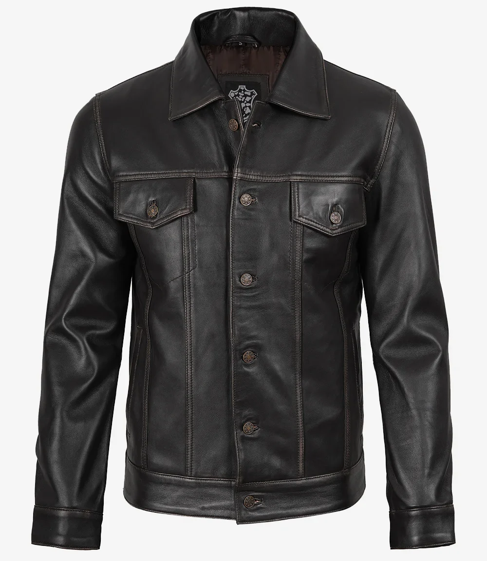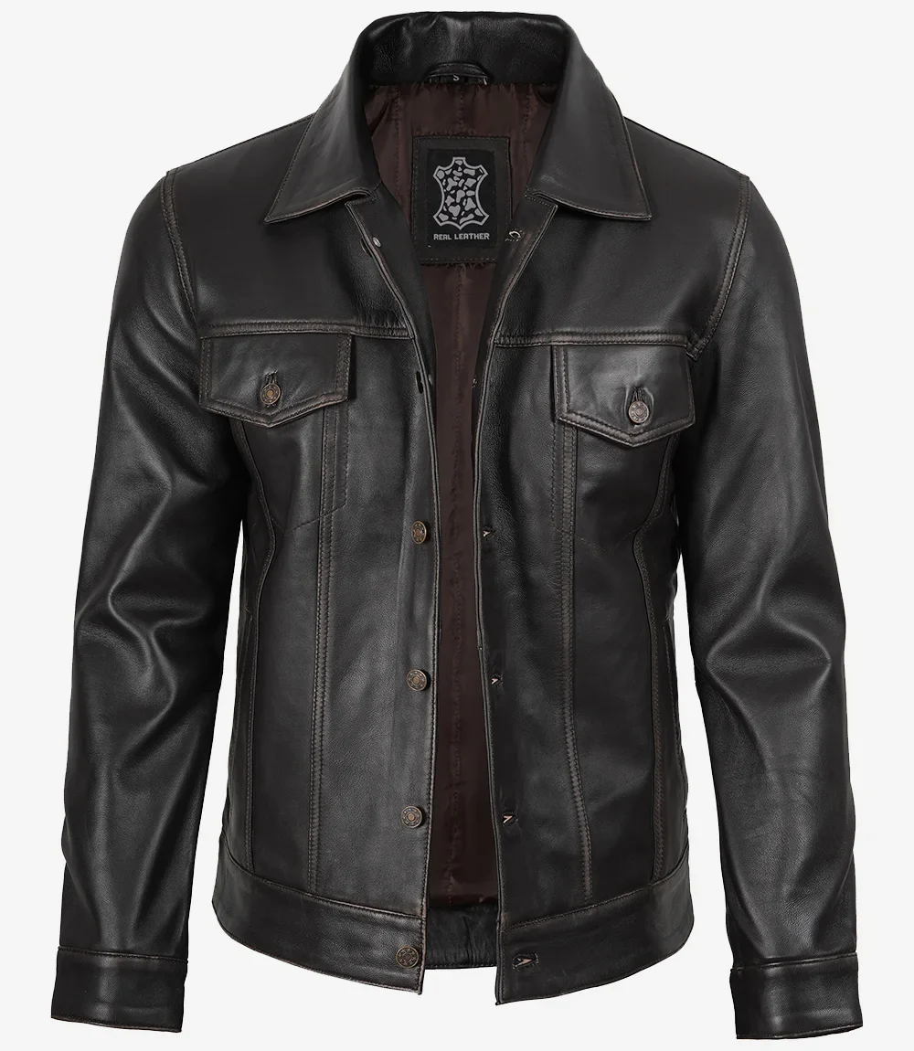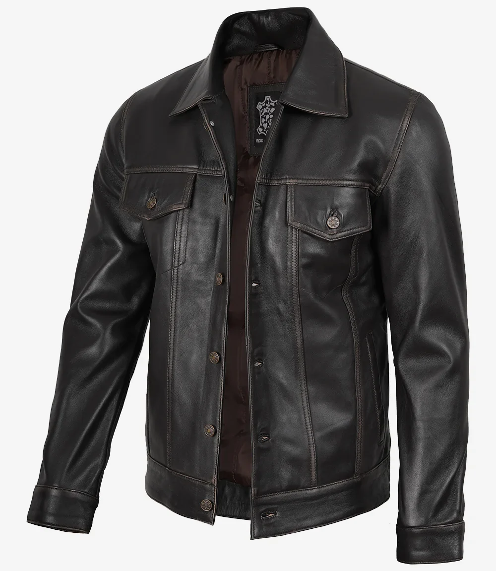 Blazer en cuir marron vieilli à revers crantés pour homme – Deux boutons