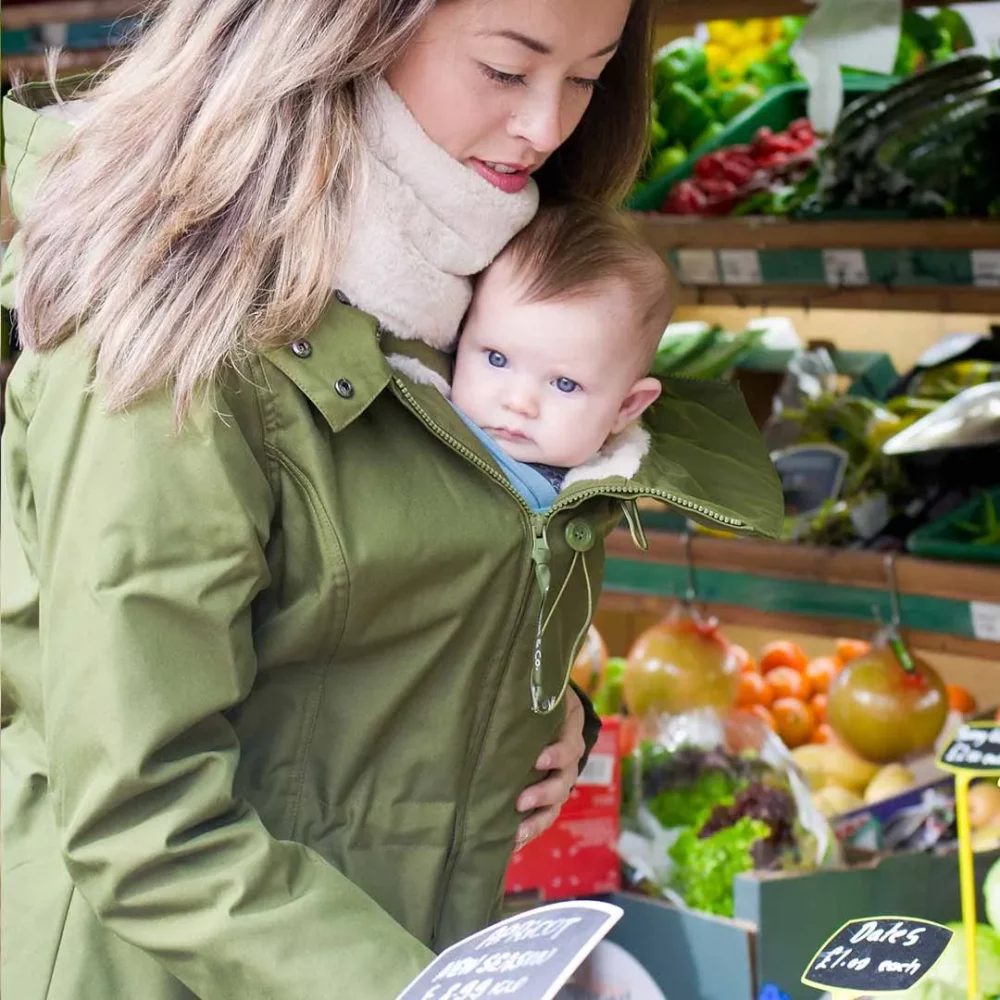 Vous y trouverez des cordons de réglage pour ajuster le manteau à votre taille ou à votre ventre au fil des mois durant la grossesse. L’insert détachable vous permettra de porter devant ou dans le dos.