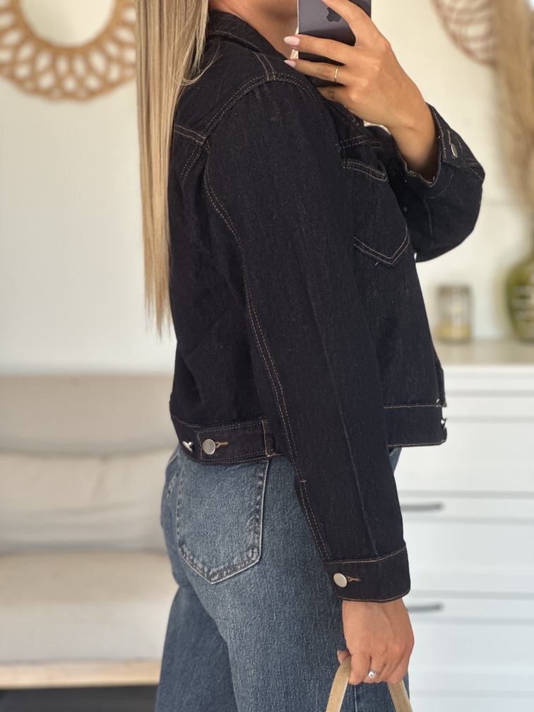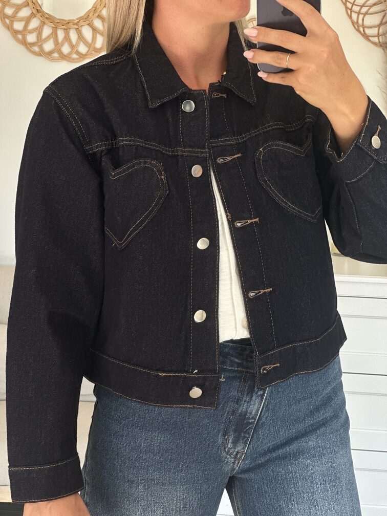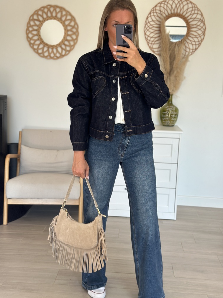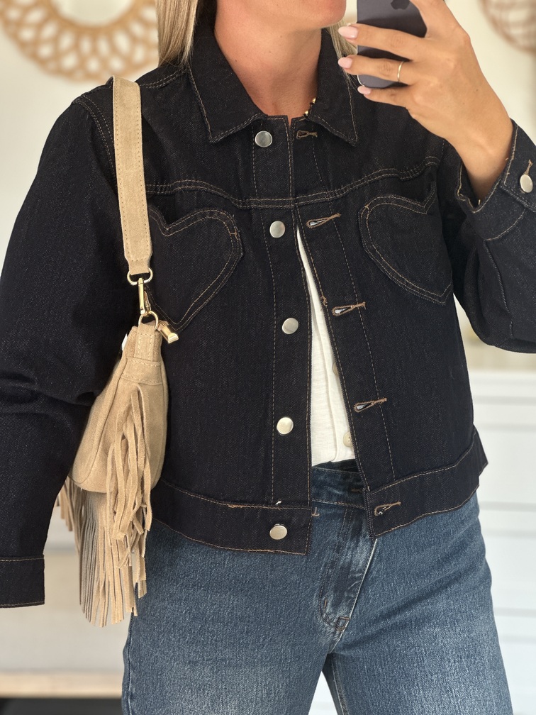 Veste ELISA Veste Coloris : bleu jean’s foncé Col chemise Coupe droite Coeur sur les poches Tailles = S : 36, M : 38, L : 40 Composition : 100% coton Le modèle porte du S et mesure 1m65