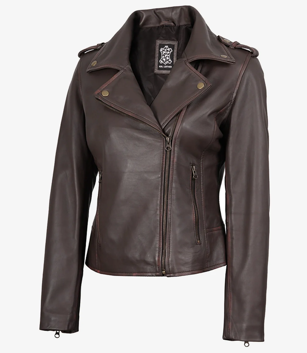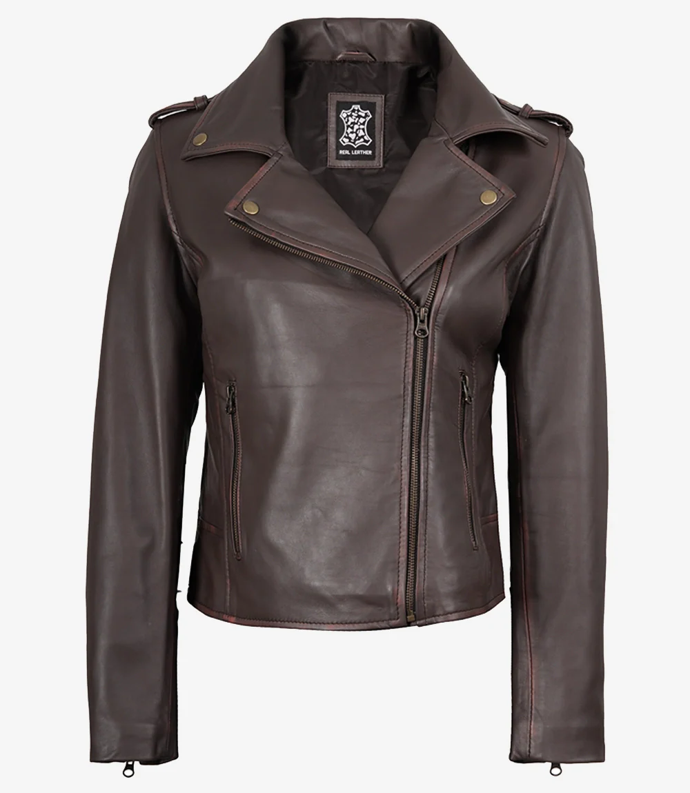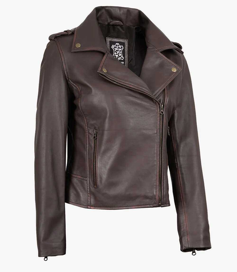Veste en cuir marron vieilli style motard pour femme