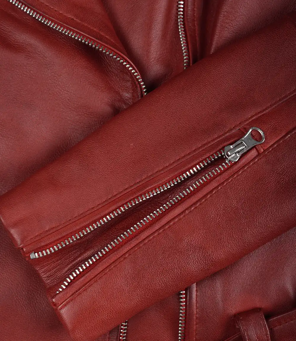 Veste en cuir asymétrique rouge style motard pour femme avec ceinture