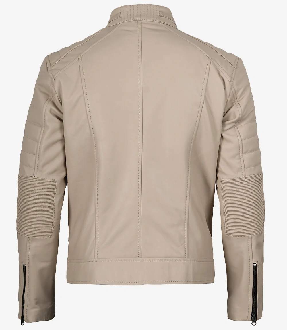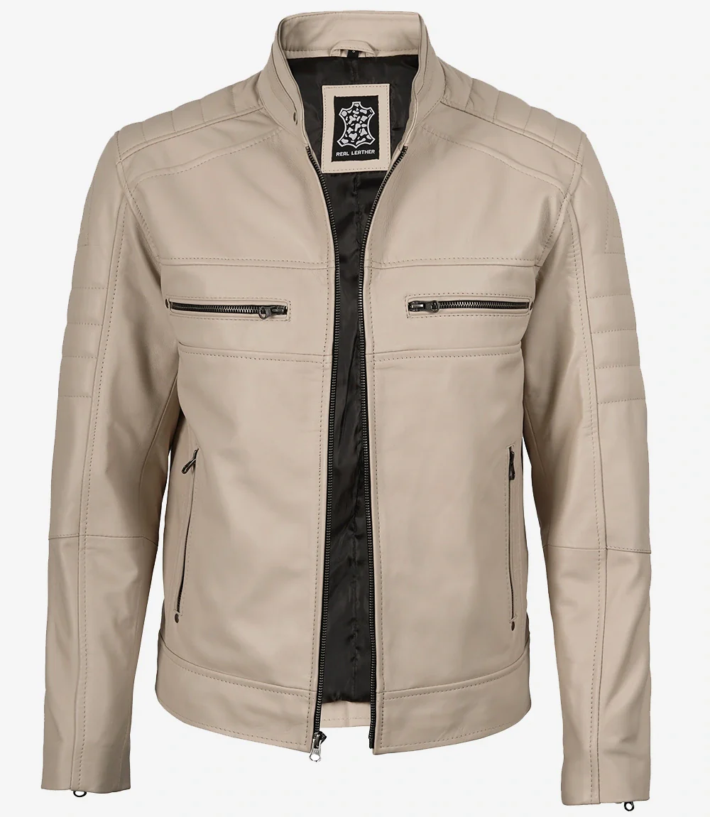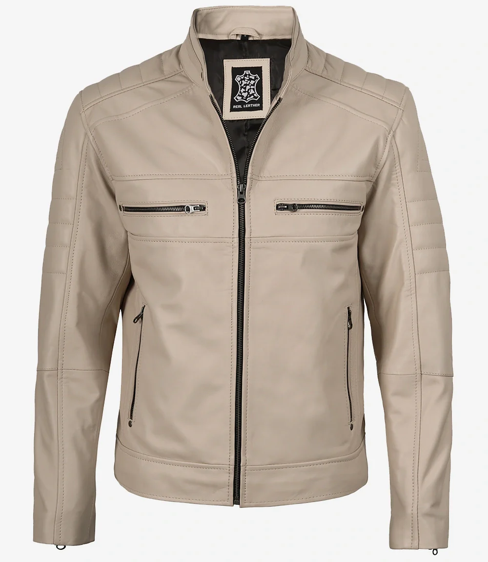 Veste en cuir beige style motard à col mandarin pour homme