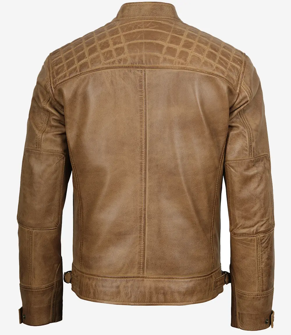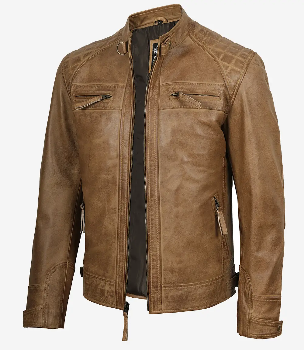 Veste en cuir marron camel style motard pour homme avec épaules matelassées