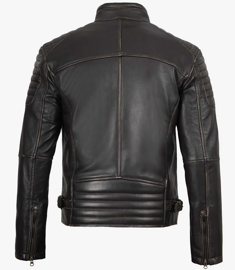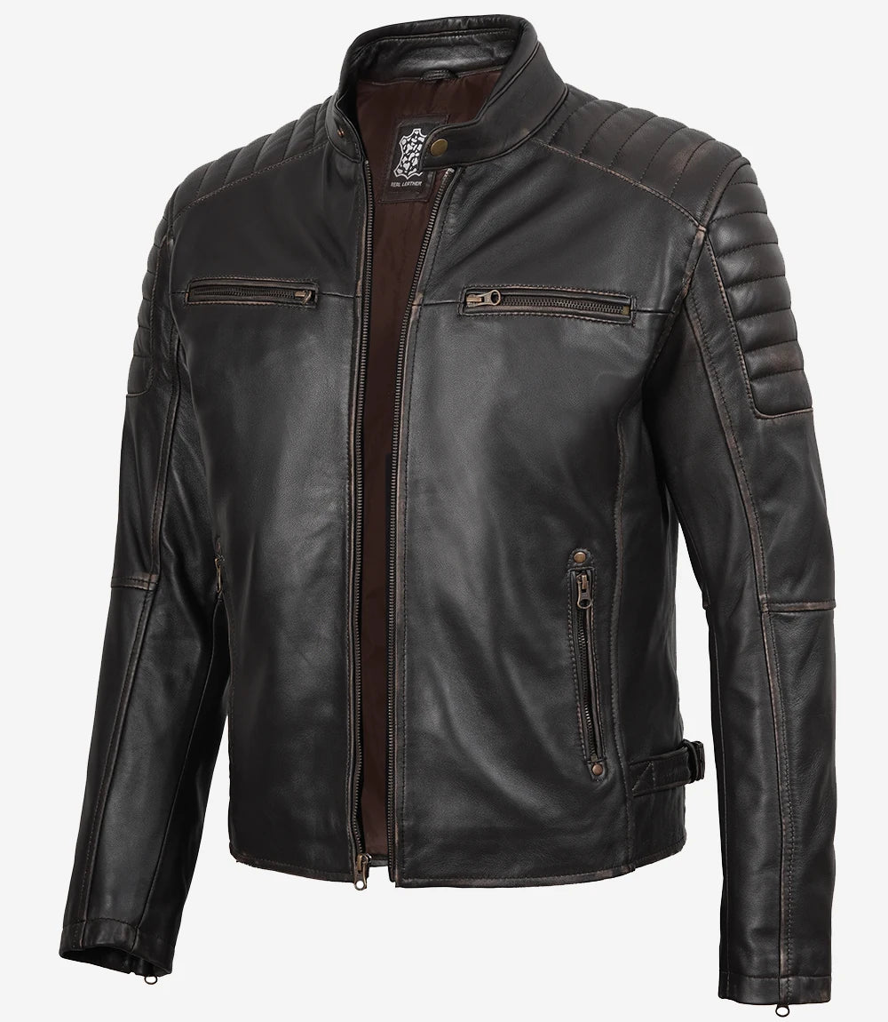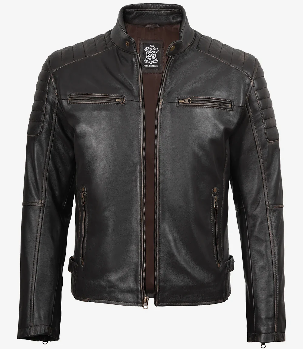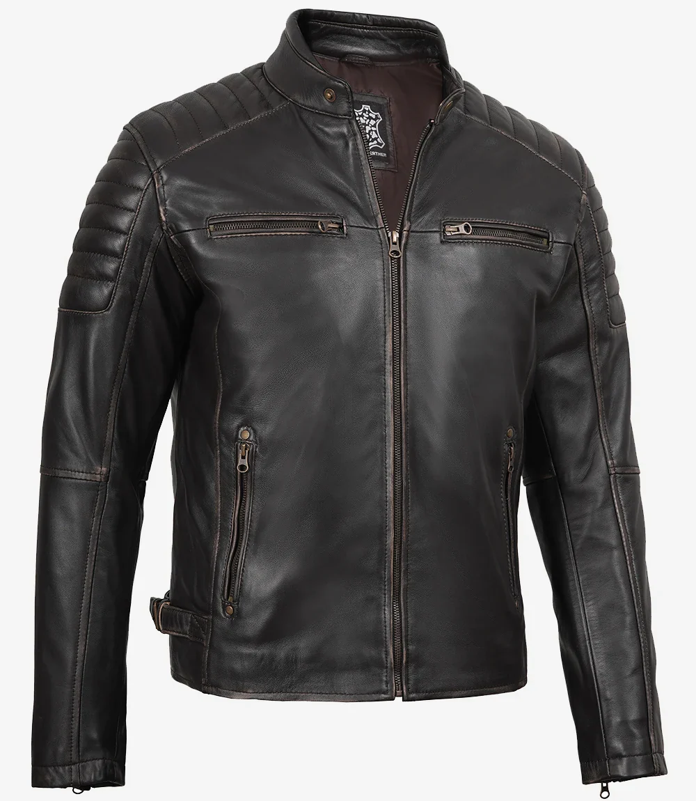 Veste en cuir marron chocolat style motard pour homme – Épaules matelassées
