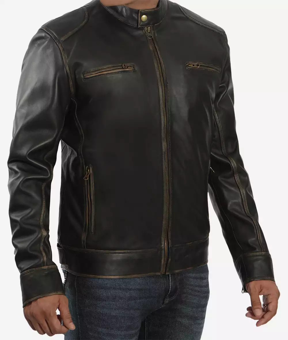 Veste en cuir marron vieilli style motard pour homme