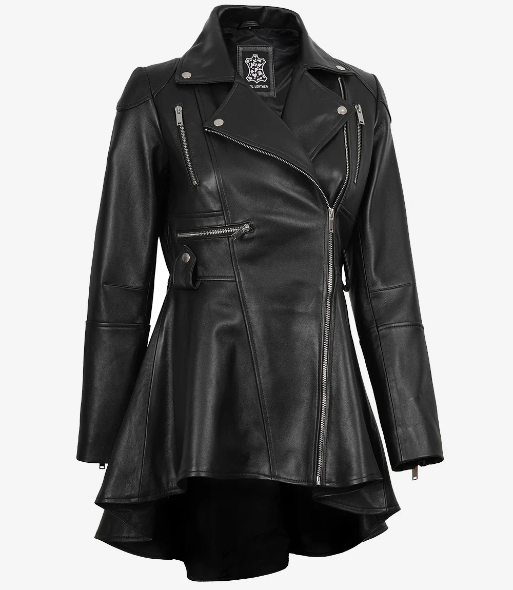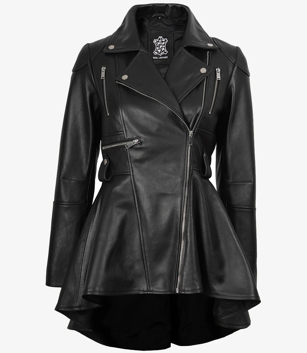 Cette veste péplum en cuir noir est une tenue exceptionnelle pour un look à couper le souffle. Son dos façon robe, son devant court et ses fermetures éclair argentées lui confèrent une silhouette élégante. Confectionnée en cuir d’agneau véritable, elle est entièrement doublée d’une doublure intérieure en polyester doux pour la peau, vous permettant de la porter toute la journée sans effort.