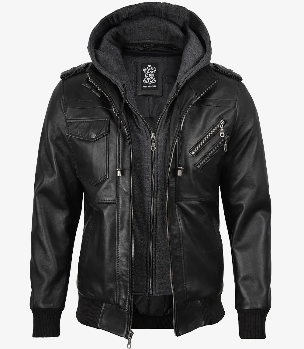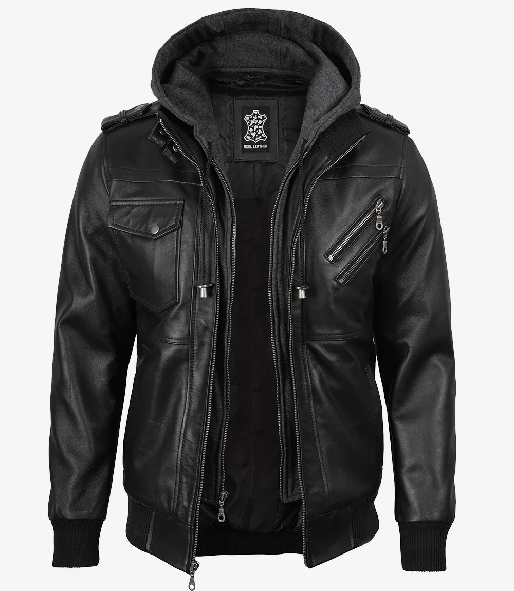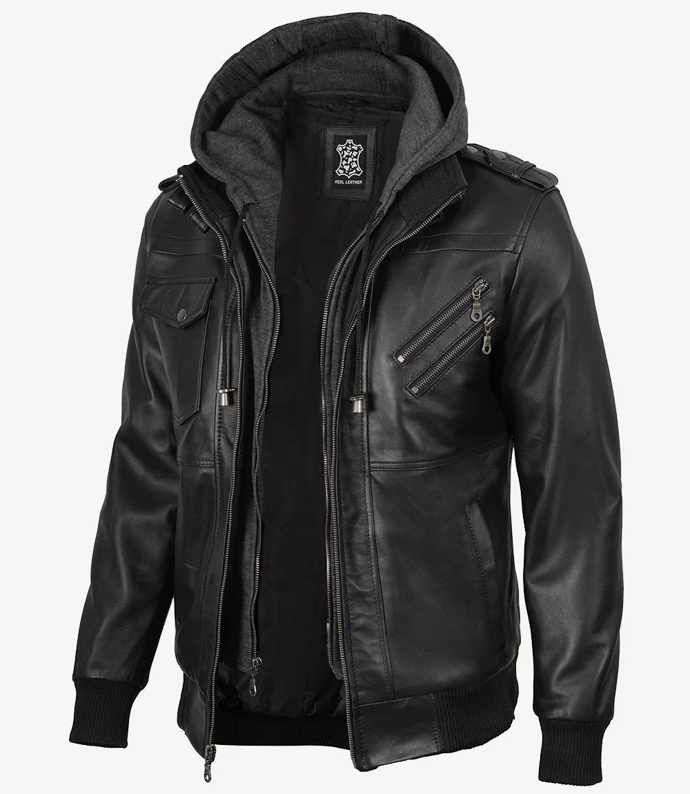 Blouson aviateur en cuir noir pour homme avec capuche amovible