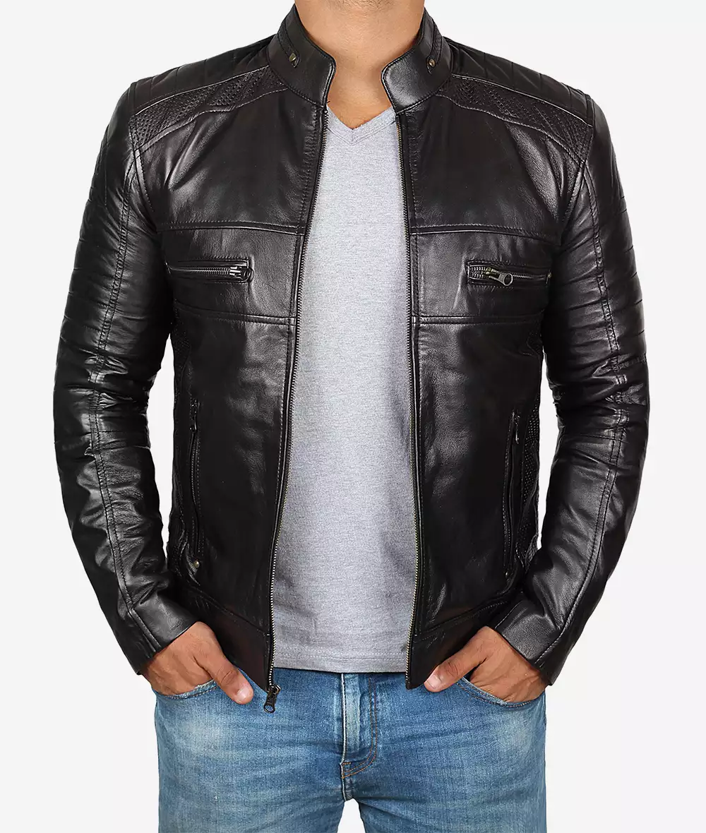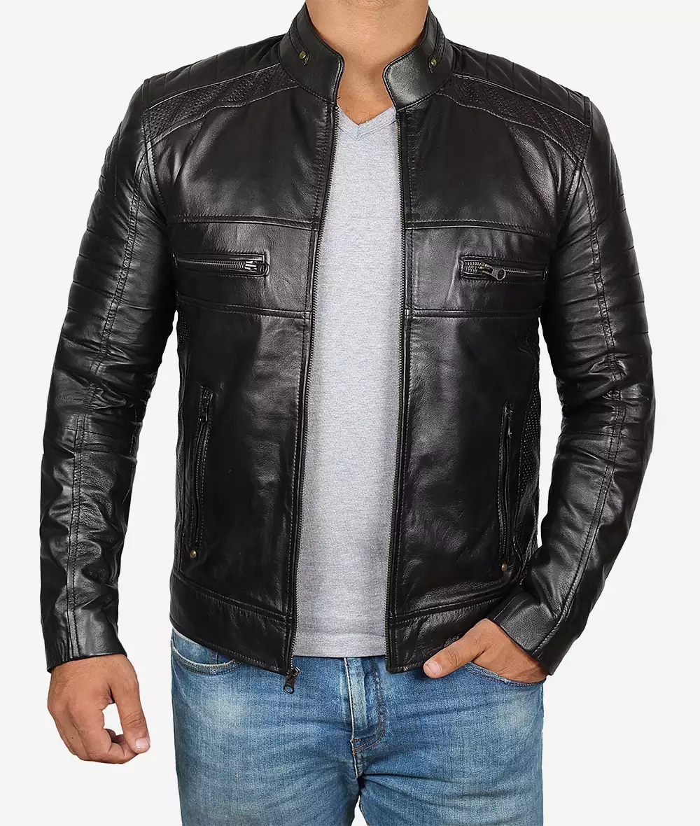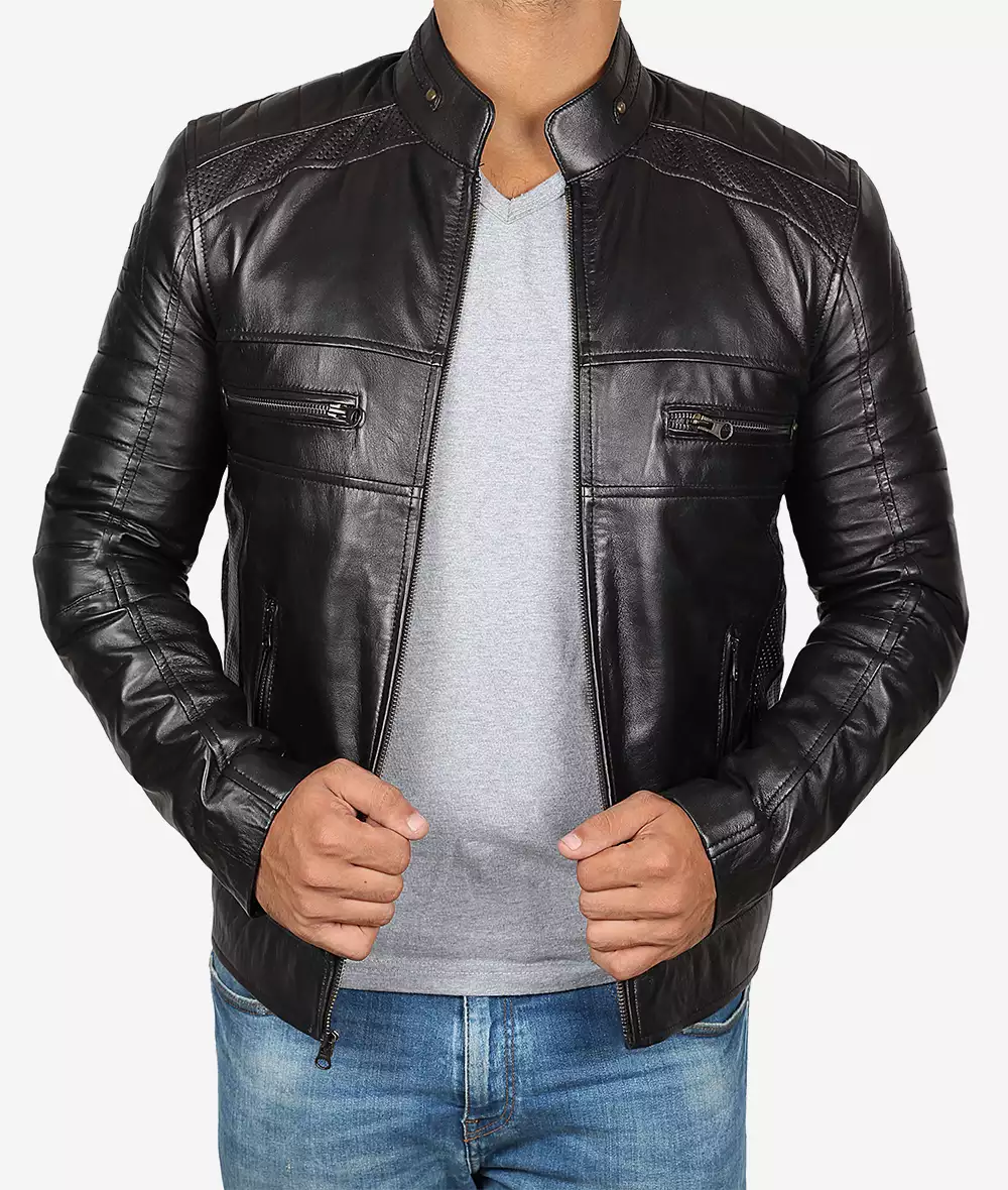 Veste en cuir noire style motard pour homme grand – épaules matelassées