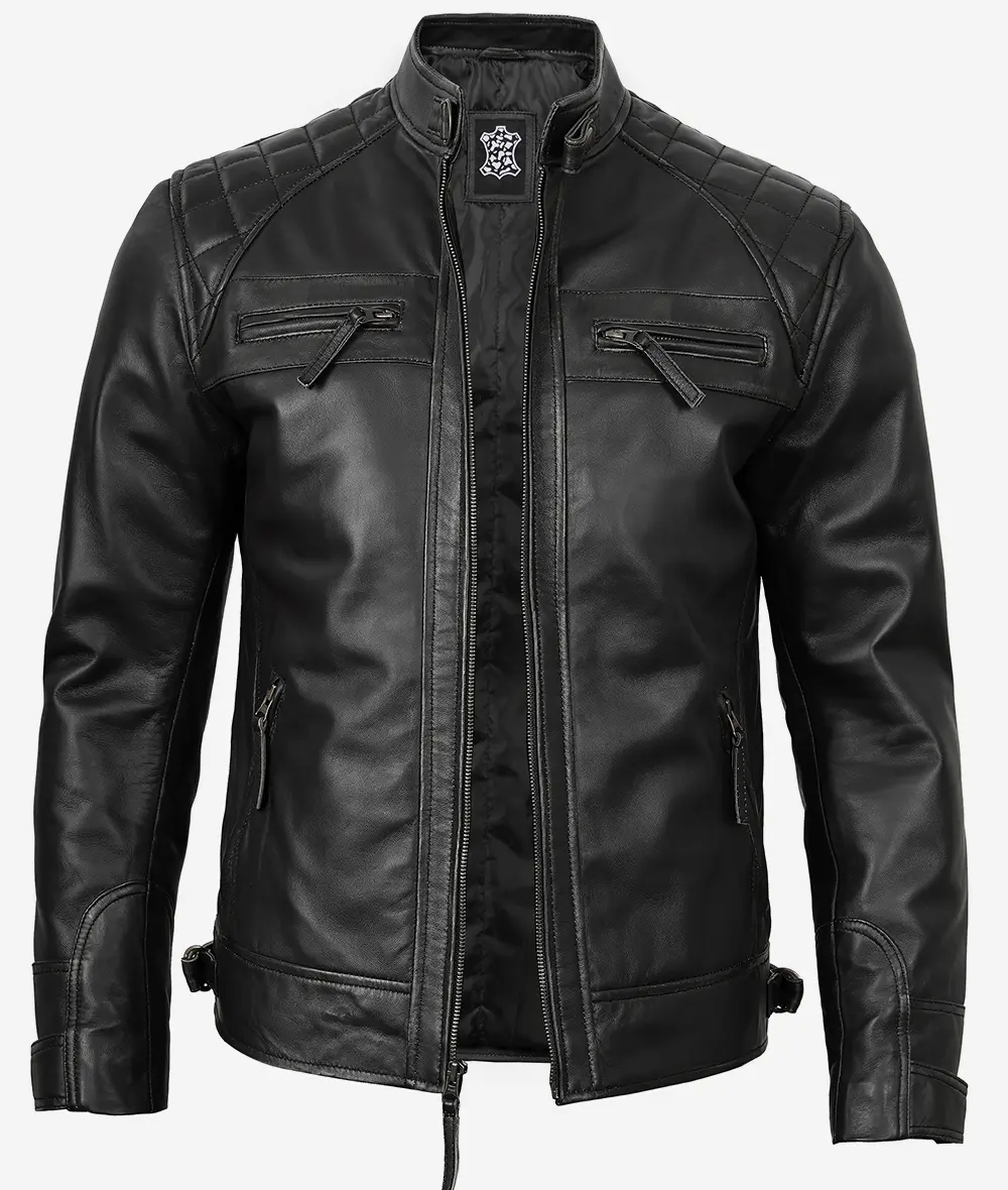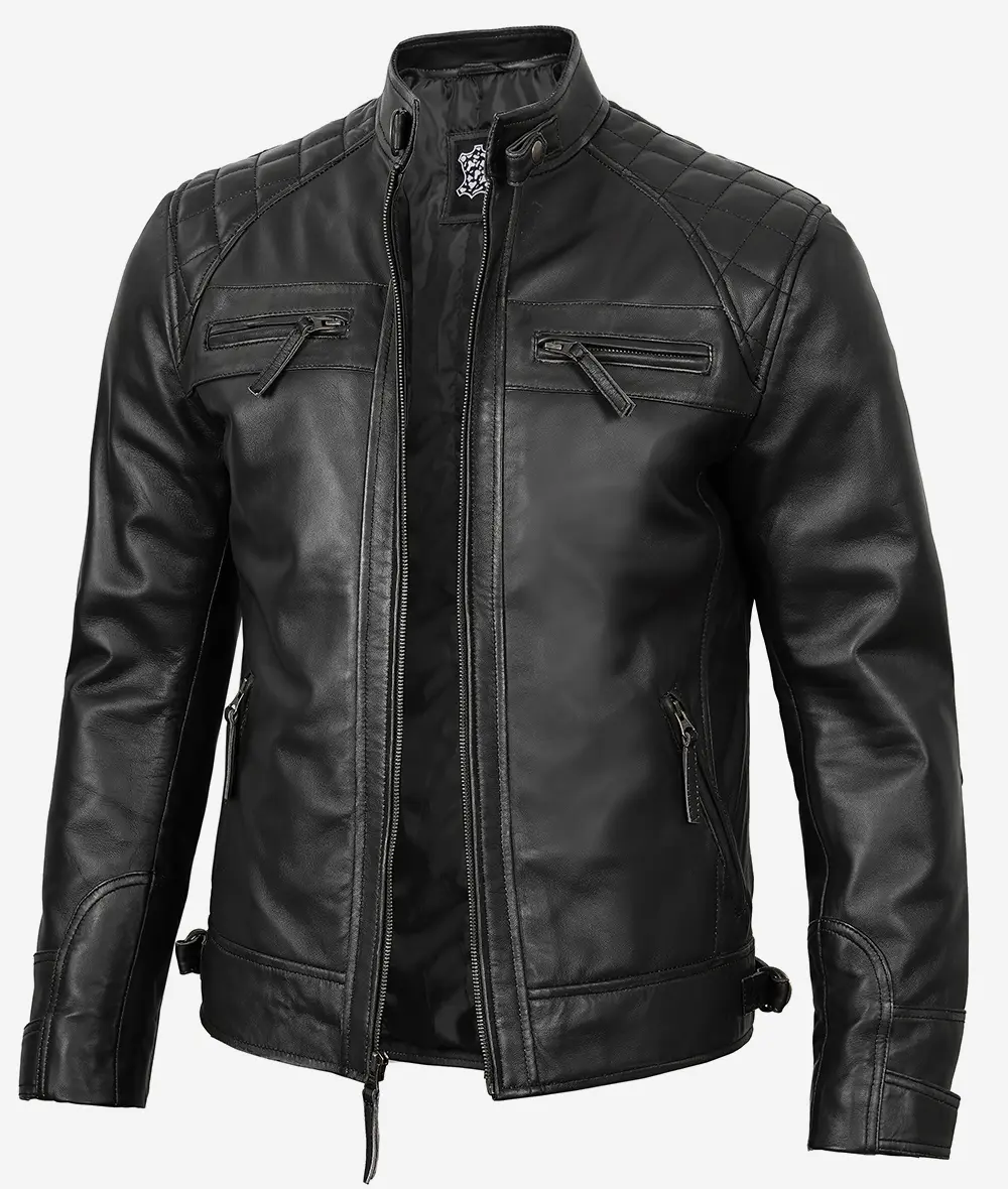 Veste en cuir noir style motard pour homme – Épaules matelassées