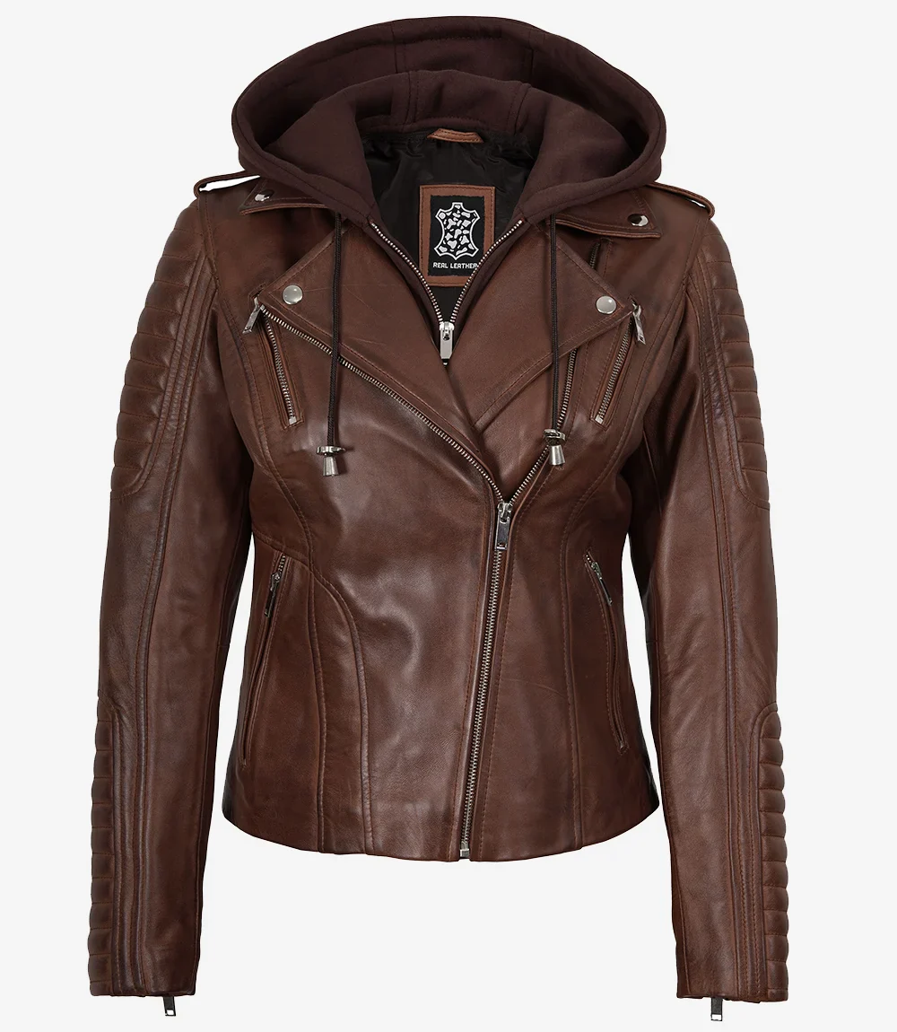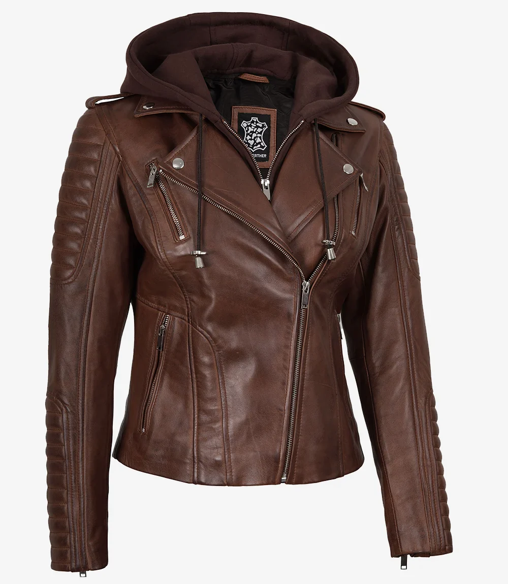 Veste en cuir style motard cognac pour femme avec capuche amovible